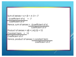 The document defines different types of polynomials and their key properties. It discusses linear, quadratic, and cubic polynomials, and defines them based on their highest degree term. It also covers the degree of a polynomial, zeros of polynomials, and the relationship between the zeros and coefficients of quadratic and cubic polynomials. Finally, it discusses the division algorithm for polynomials.