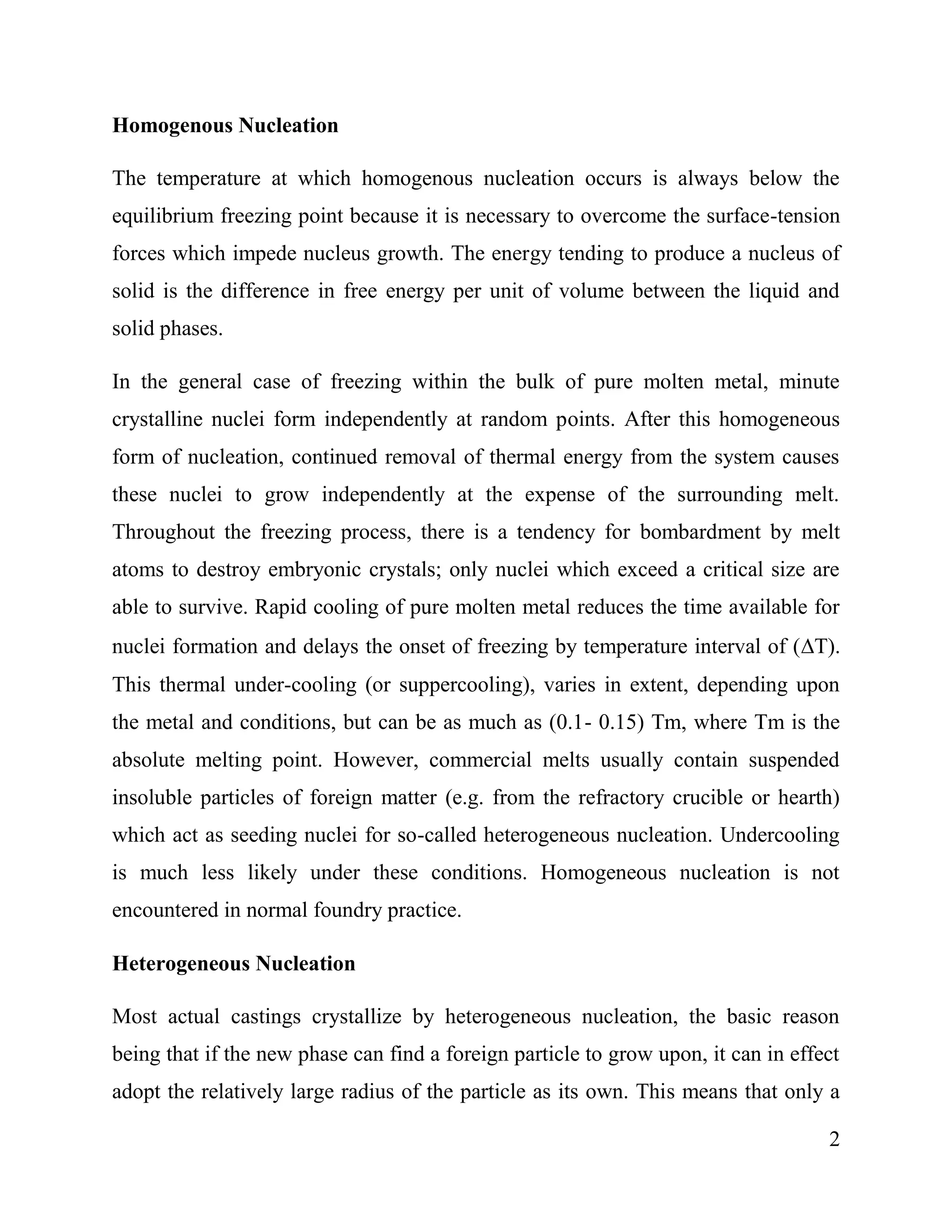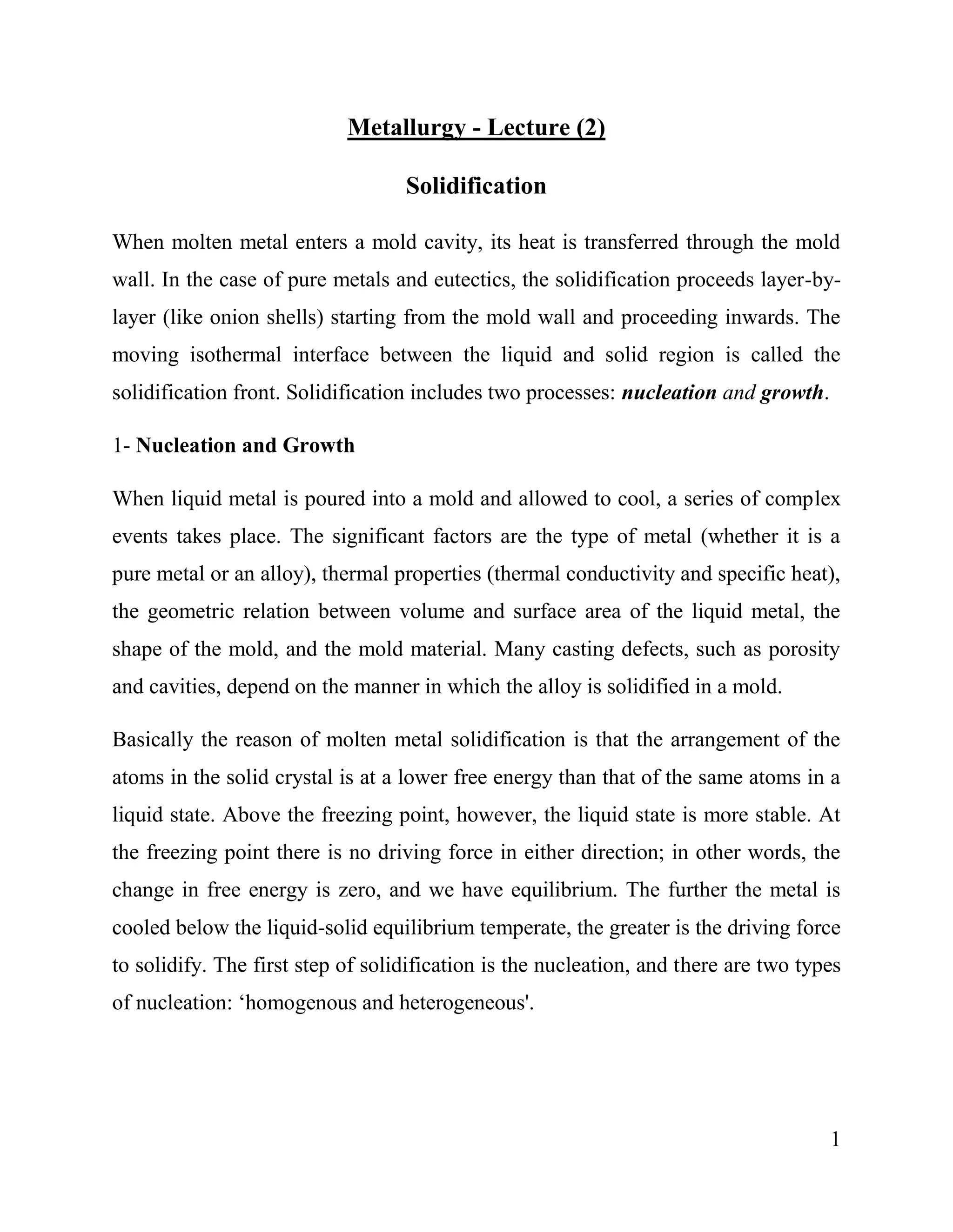 1. Solidification of metals occurs through nucleation and growth processes. Nucleation can be homogeneous (within the bulk liquid) or heterogeneous (on foreign particles). Heterogeneous nucleation is more common.
