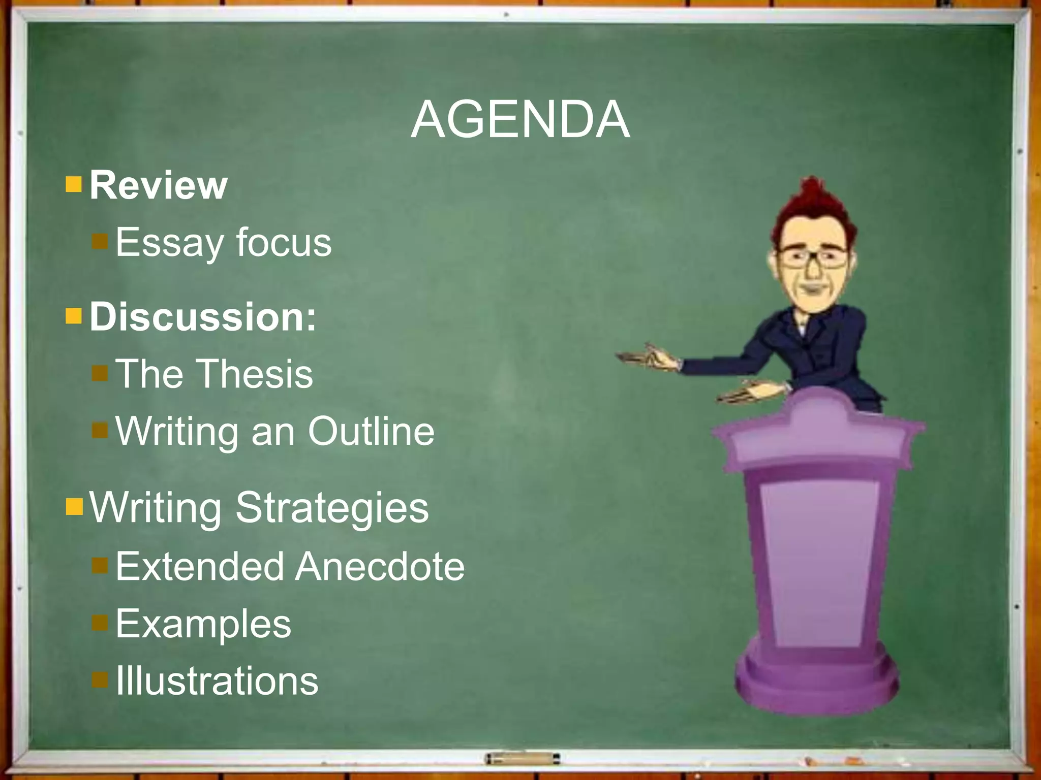 This document contains the agenda and notes for an EWRT 1A class. It discusses focusing an essay concept, developing a thesis statement, and outlining. It provides examples of effective thesis statements and uses classification and examples as writing strategies. Students are instructed to draft a working thesis on their concept in 10 minutes and post an outline for their essay, including a preliminary anecdote, thesis, categories, and types. Homework includes studying vocabulary.