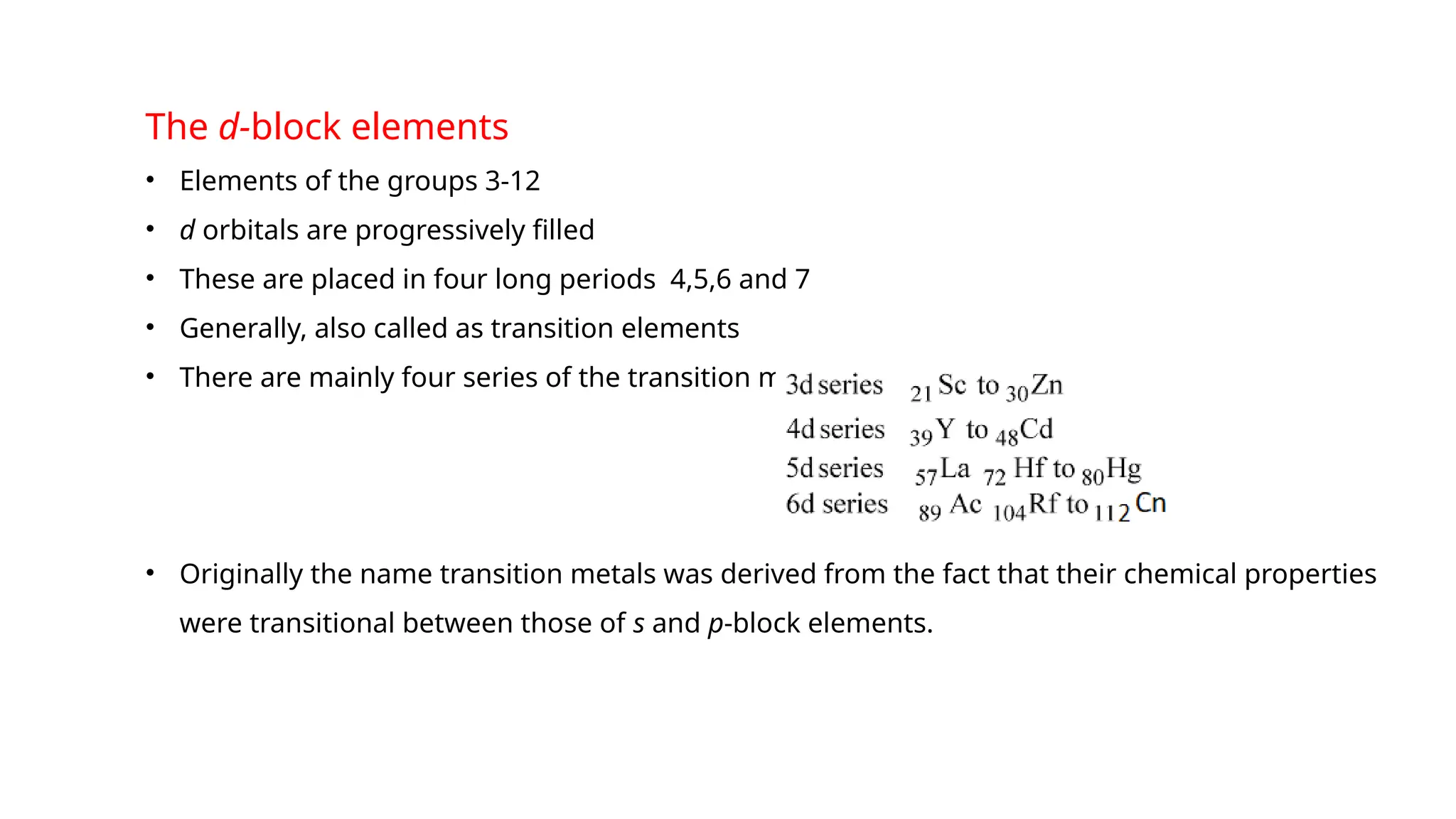 The document discusses the d- and f-block elements in chemistry, focusing on transition metals, their characteristics, and various properties such as electronic configurations, melting points, atomic sizes, ionization enthalpies, and oxidation states. It explains the significance of transition metals, their magnetic properties, colored ions, complex compounds, catalytic properties, and interstitial compounds. Additionally, it highlights trends in standard electrode potentials and the stability of oxidation states among transition metals.