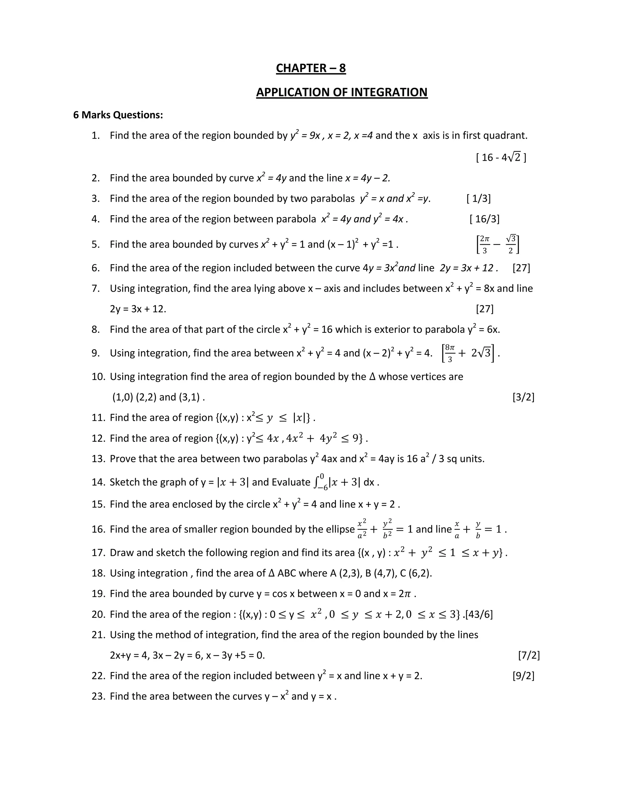 1. This document provides 31 multi-part questions involving calculating areas of regions bounded by curves using integration. The regions involve combinations of circles, parabolas, lines, and other curves.