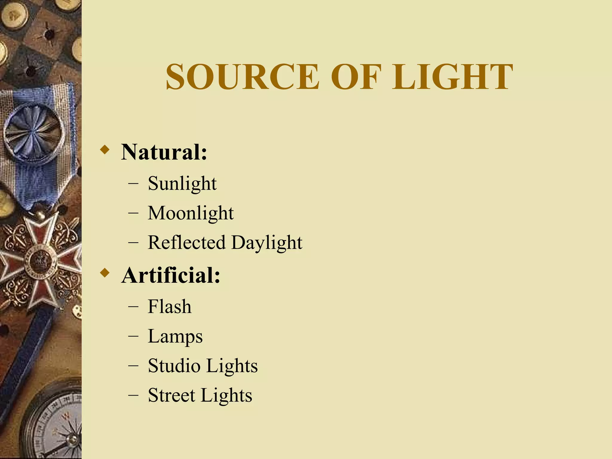 This document discusses different types of lighting sources including natural light from the sun and moon and artificial light from lamps, flashlights, and streetlights. It provides details on how natural light characteristics vary throughout the day depending on weather conditions. The text also explains how clouds impact the color and diffusion of sunlight and compares indoor and outdoor lighting, noting that indoor light is often more diffused while outdoor light can include artificial sources. Mixed indoor lighting combining natural and artificial sources is also mentioned.