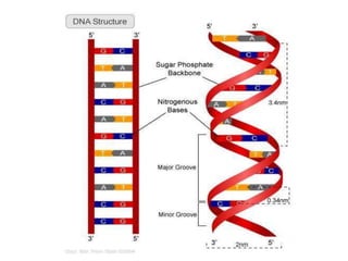 DNA is the genetic material present in all living cells. It is a double-stranded molecule composed of deoxyribose, phosphate groups, and nitrogenous bases. DNA replicates semi-conservatively to produce two identical copies of itself during cell division. It carries genetic information that is transcribed into mRNA which is then translated into proteins.