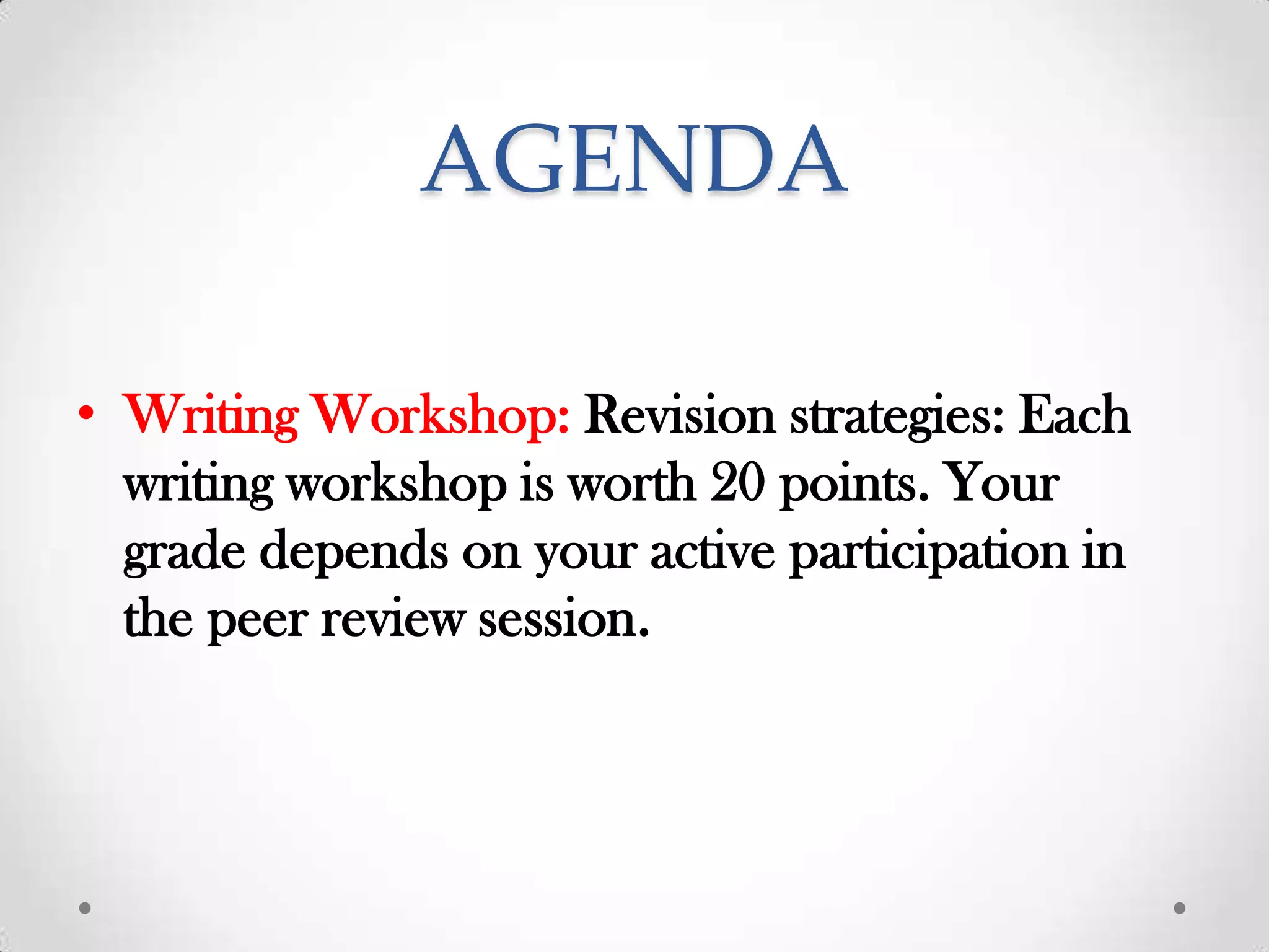 This document provides the agenda and instructions for an in-class writing workshop focused on revision. Students will work in groups of three to provide peer feedback on draft essays. The process involves each writer reading their draft aloud while the other two students follow along and take notes. Students are instructed to focus on revising based on a 12-point feedback worksheet rather than editing for grammar or word choice. The goal is to help writers improve their papers in terms of organization, content, integrating quotations, and MLA style through a structured peer review and revision process.