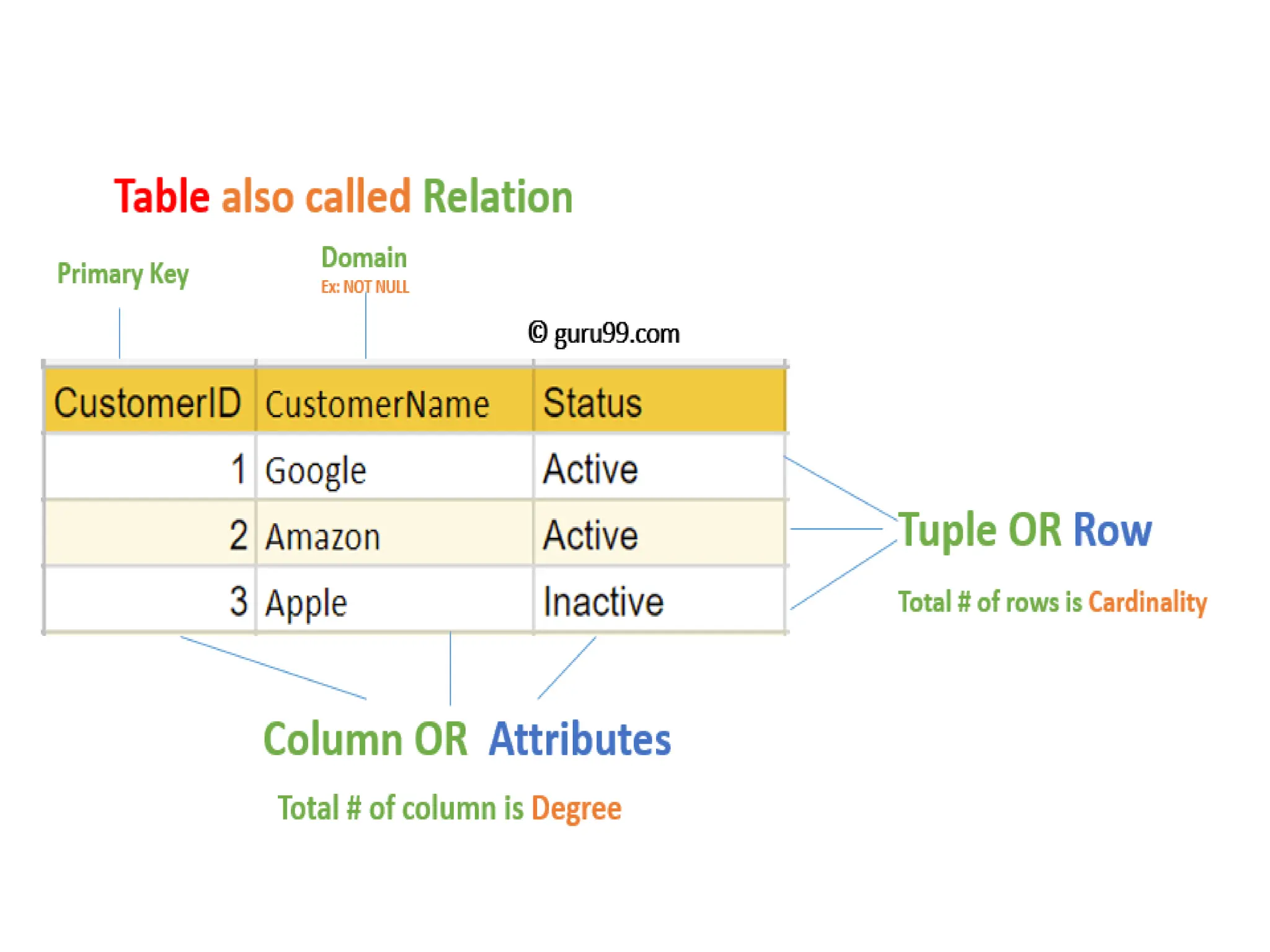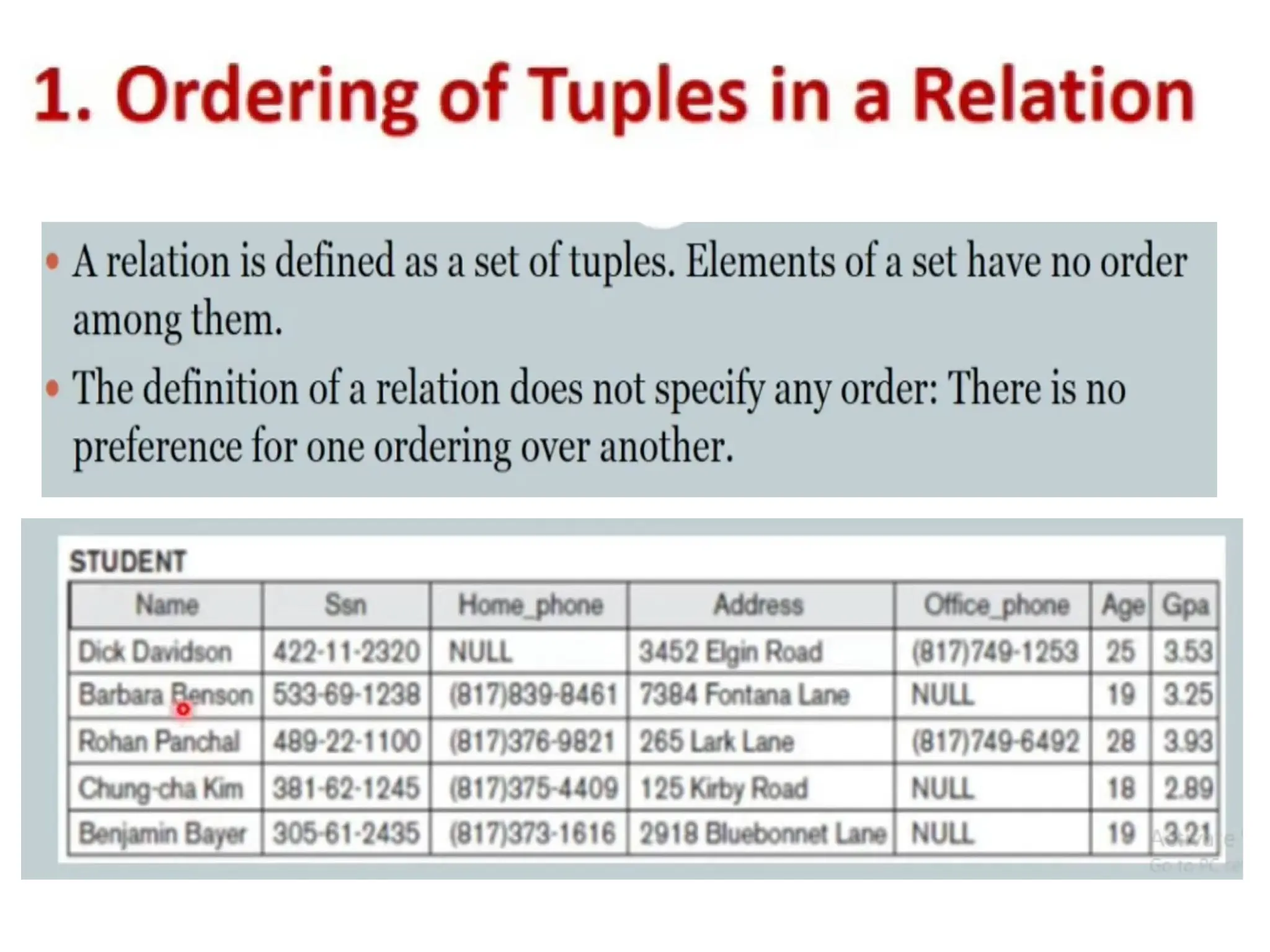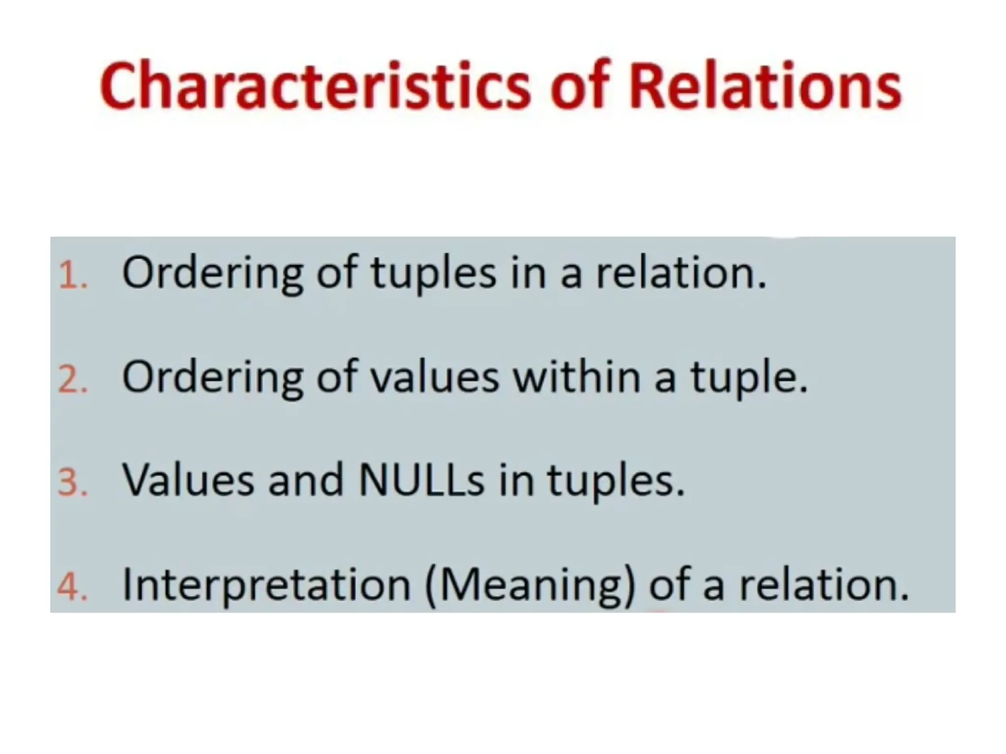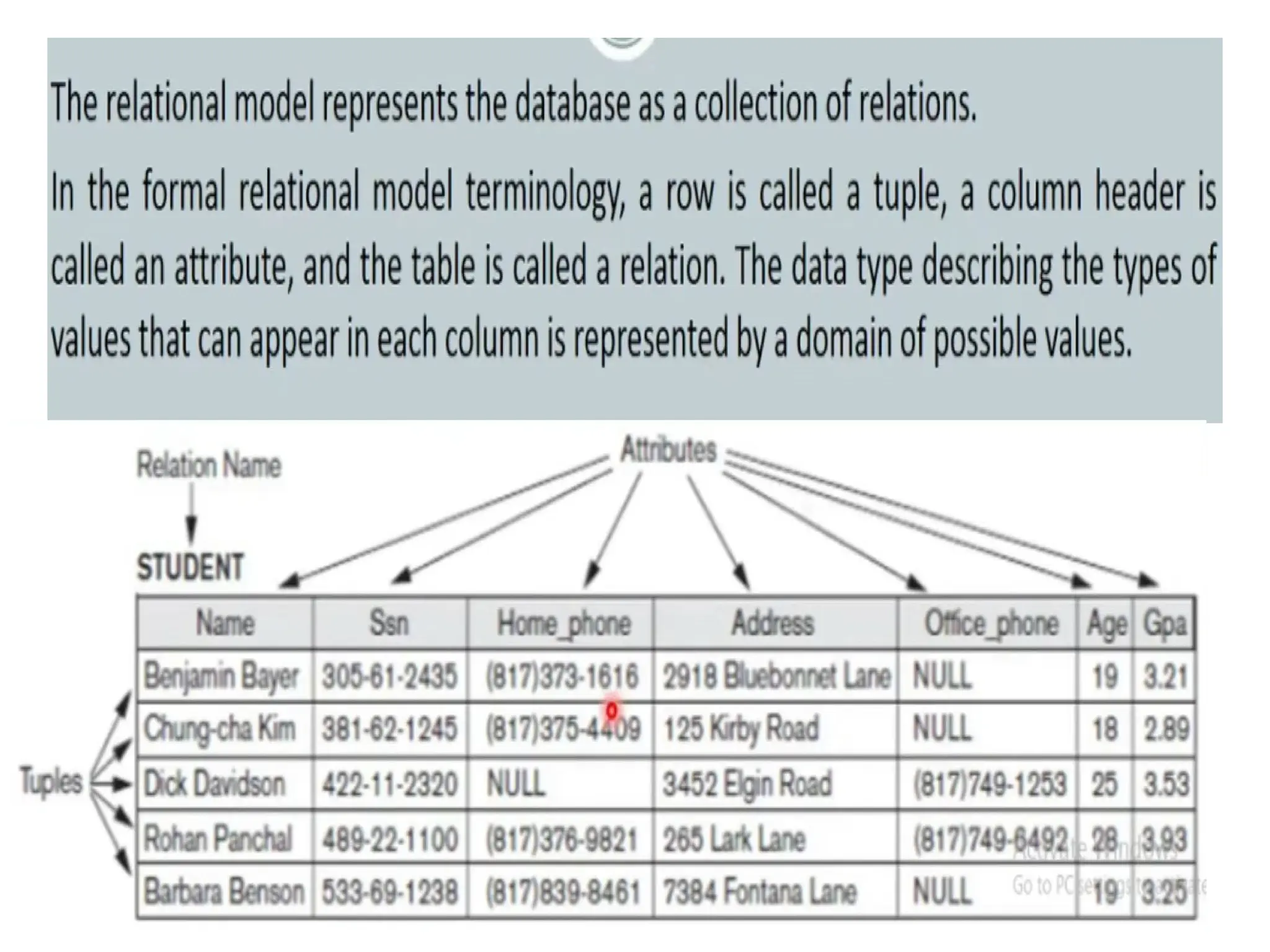 #27 the relational model represents the database as a collection of relations , each relation resembles a table of values each row in the table represents a collection of related data values , all values in a column are of the same data type, terminology, a row is called a tuple, a column header is called an attribute the table is called a relation the data type describing the types of values that can appear in each column is represented by a domain.