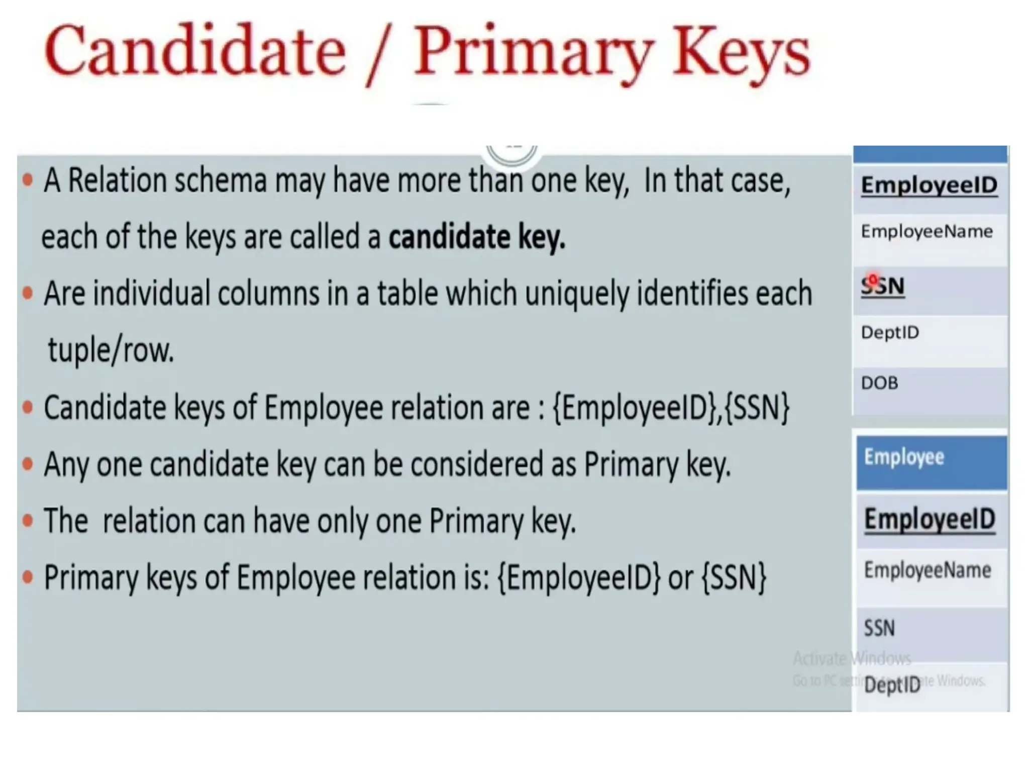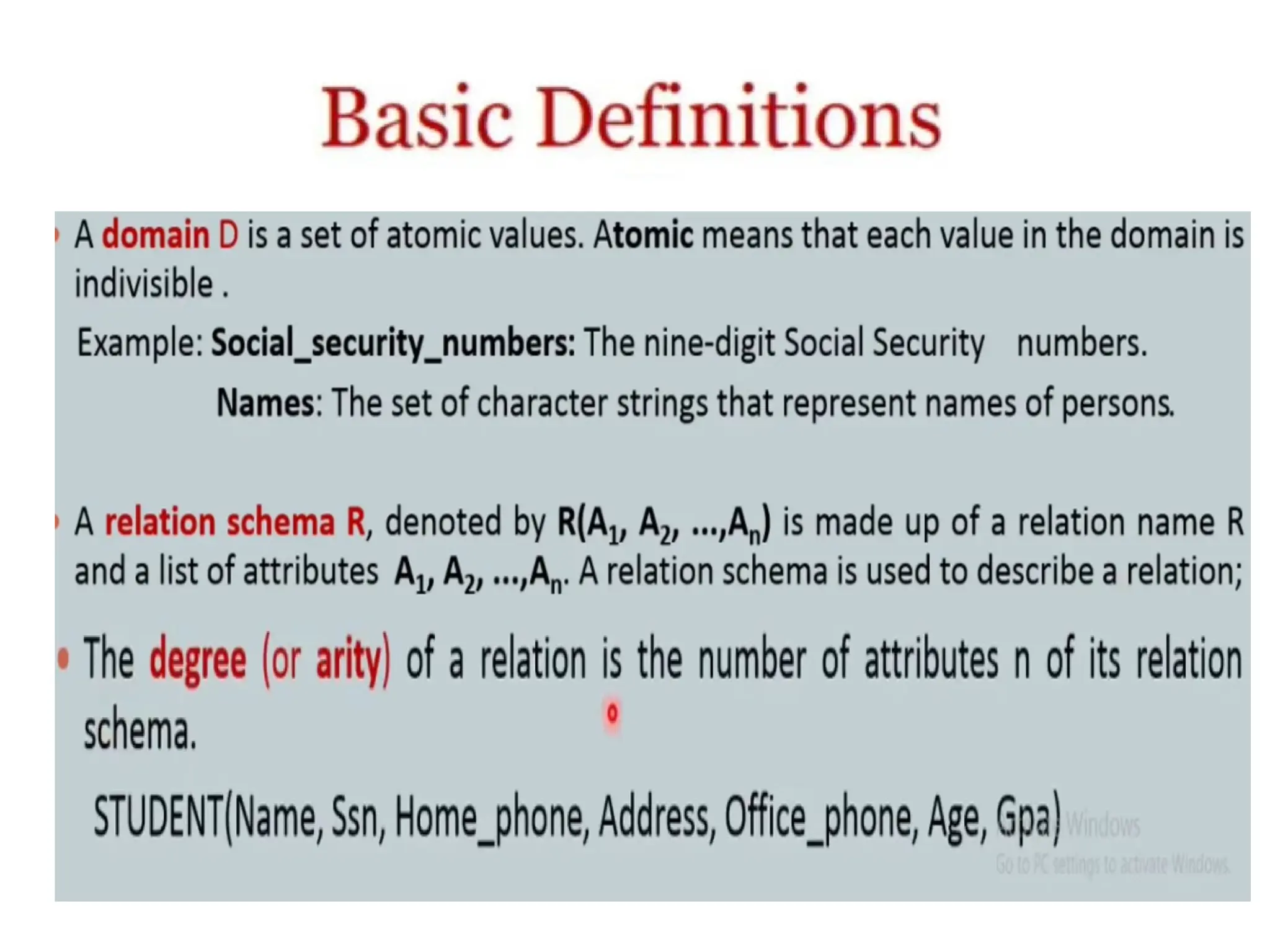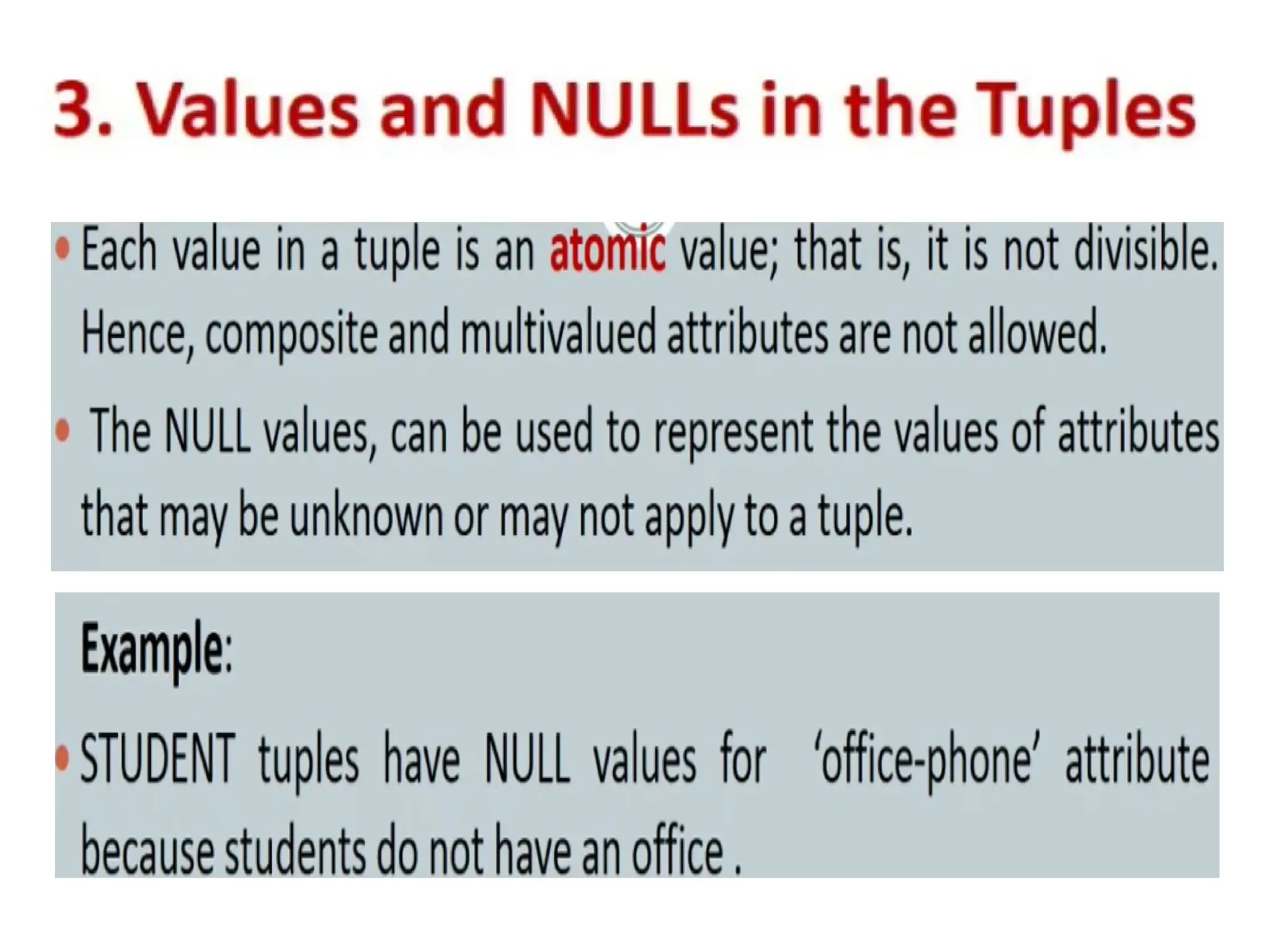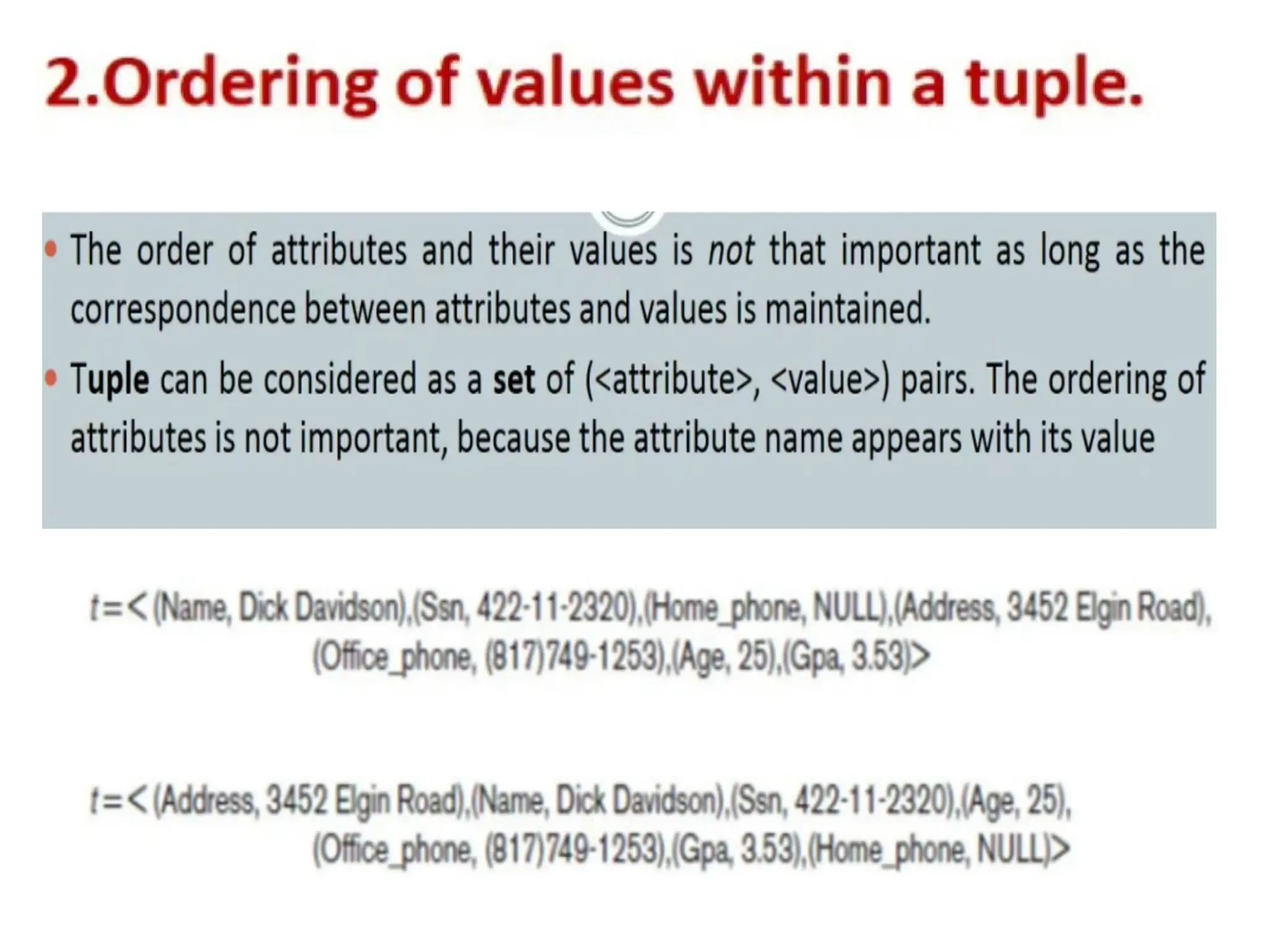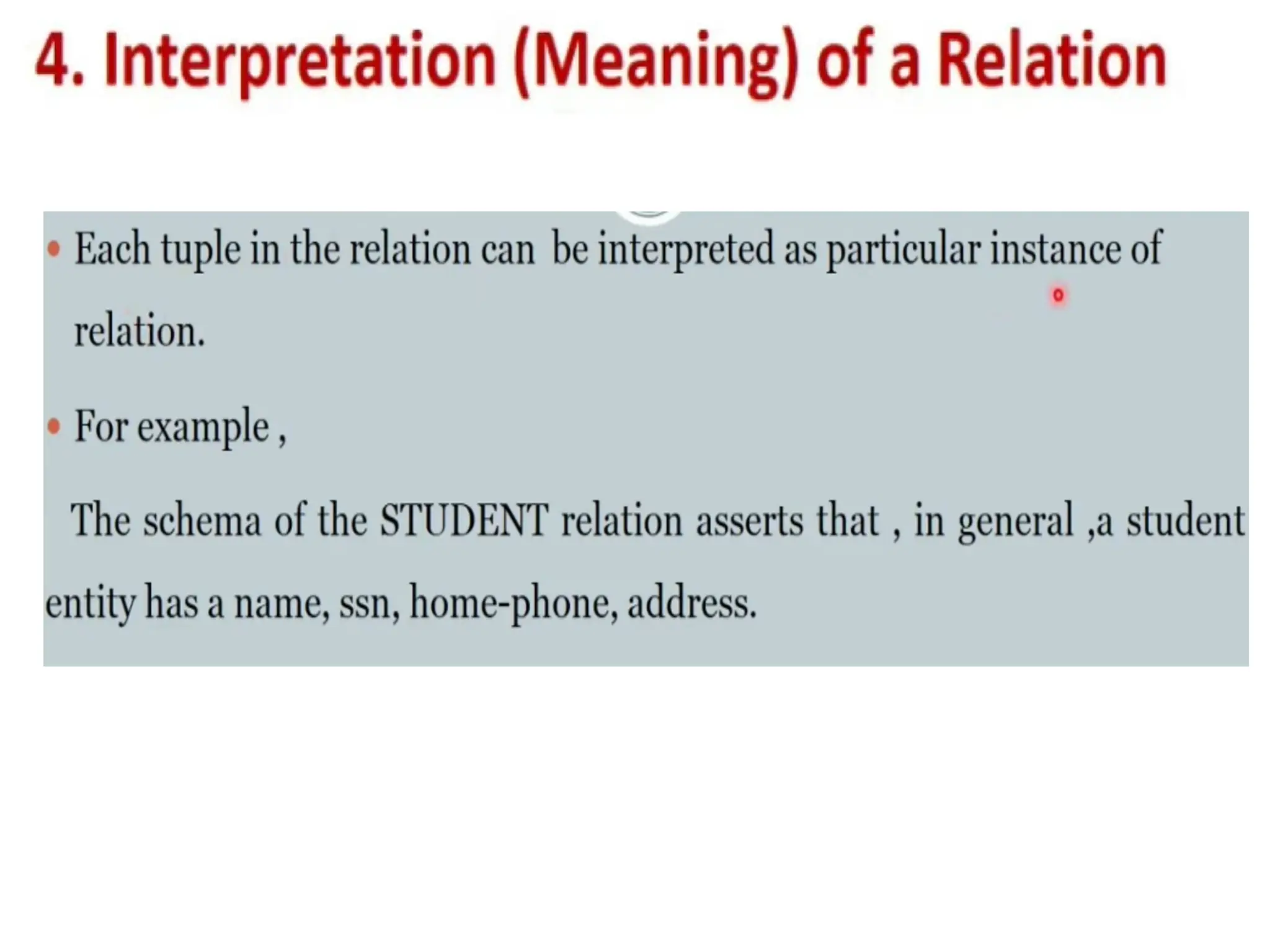 #27 the relational model represents the database as a collection of relations , each relation resembles a table of values each row in the table represents a collection of related data values , all values in a column are of the same data type, terminology, a row is called a tuple, a column header is called an attribute the table is called a relation the data type describing the types of values that can appear in each column is represented by a domain.