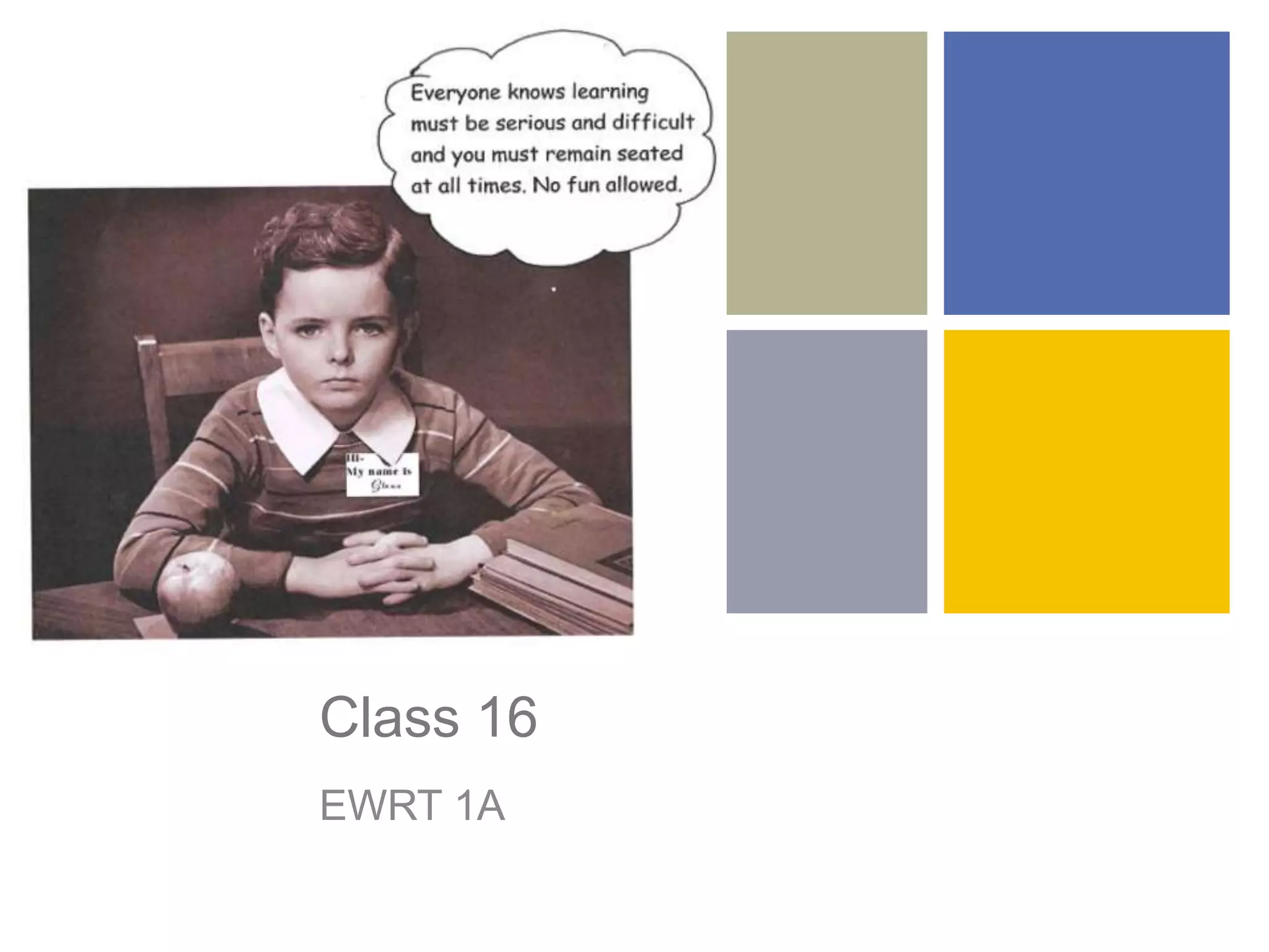 The document outlines the agenda for Class 16 of an EWRT 1A course. It discusses reviewing Essay #4, which will cover incorporating a counterargument and alternative solutions. Students will outline their essays and learn how to integrate and cite sources properly. The document provides guidance on developing a counterargument, considering alternative solutions, and creating an outline. It also offers tips on integrating quotations, citing summarized information, and formatting block quotations and in-text citations correctly.