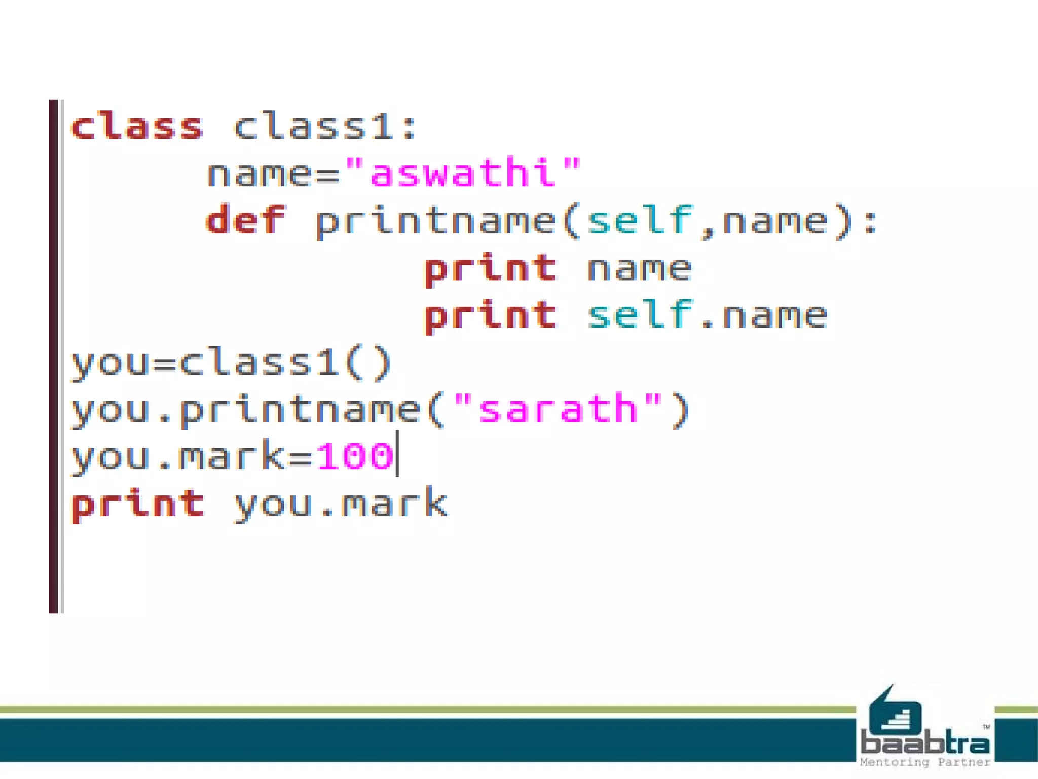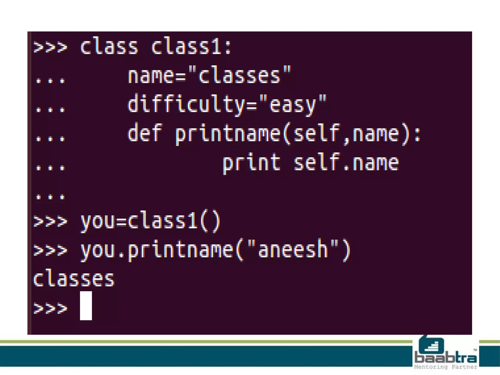 This document provides an overview of classes and objects in Python. It defines a class as a way to bind data and functions together. An object is an instance of a class and represents real-world entities with unique identities and behaviors. The document discusses class attributes like __dict__, __doc__, and __name__. It also covers access specifiers like private, protected, and public and provides examples of declaring classes and creating class objects in Python.