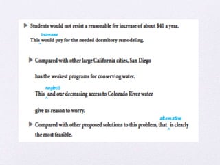 The document provides guidance on writing essay and speech outlines, including introducing the problem and its seriousness, proposing a solution, considering alternative solutions, and concluding with a call to action. It also discusses integrating quotations, avoiding ambiguous language, and revising sentences to include agents.