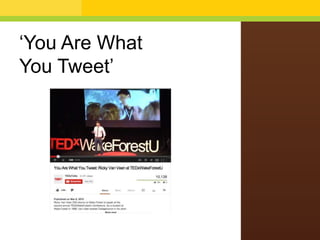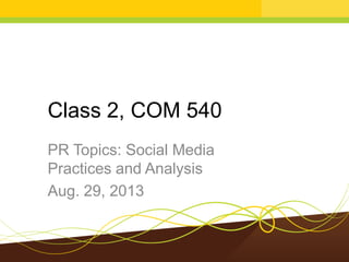 The document discusses key topics about social media practices and analysis for a PR class, including what Twitter is and how it differs from Facebook, how hashtags allow shared conversations on Twitter, and how brands can participate in social media discussions by being honest, transparent, and listening. It also summarizes key points from chapters about how social media has changed information flow and how businesses can use social media for preventive behaviors by engaging with and responding to customers.