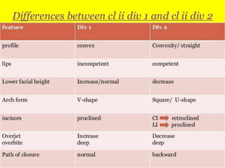 1) Angle's Class II division 2 malocclusion is characterized by a Class II molar relationship due to retroclination of the maxillary incisors. 2) Etiology can include a skeletal Class II pattern due to a retrognathic mandible or influence of soft tissue habits. 3) Treatment options include growth modification, dental camouflage, or orthognathic surgery depending on the severity of the skeletal discrepancy and dental crowding.