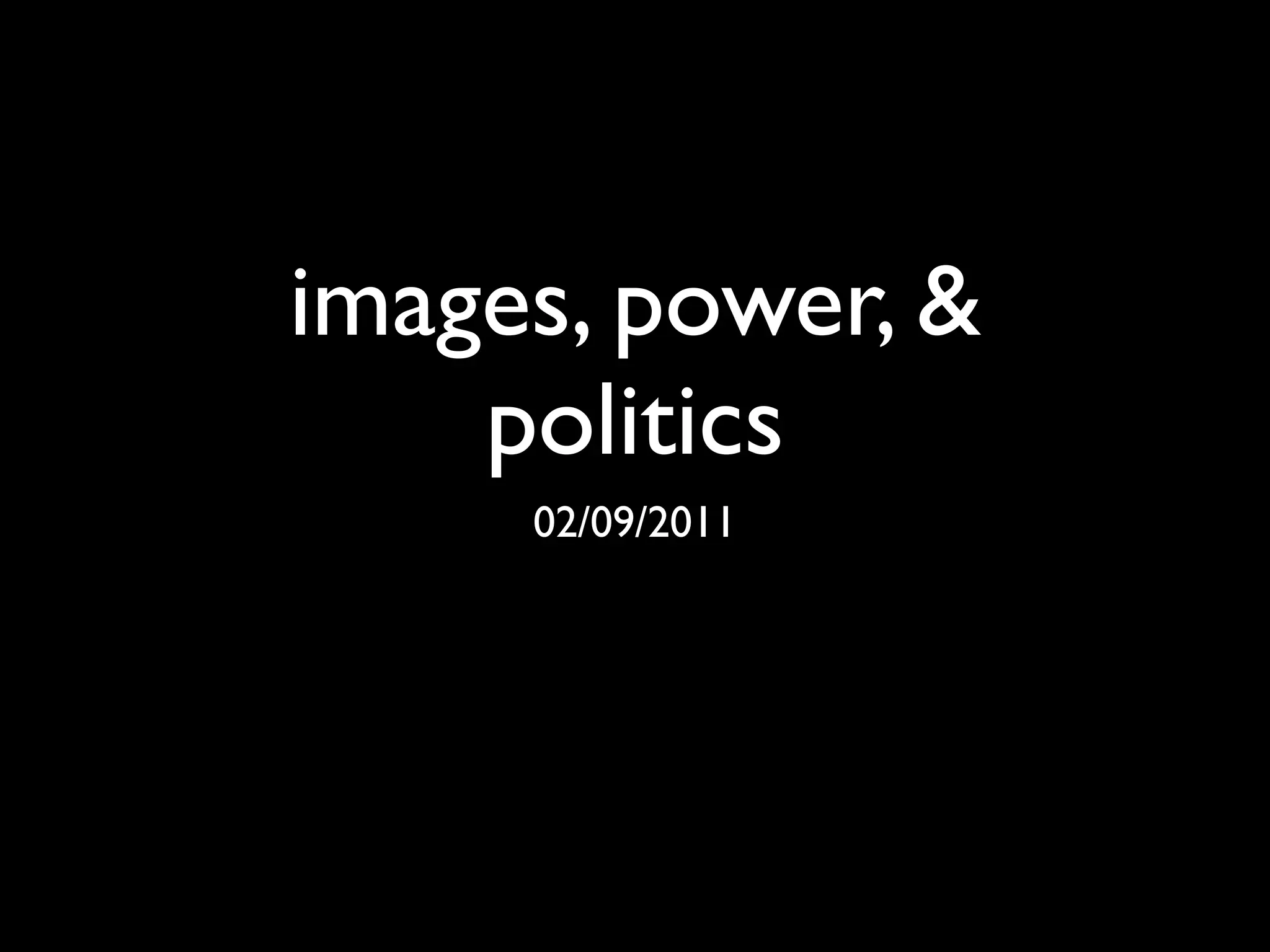 This document discusses images, power, and politics. It covers semiotics, representation, and the practices of looking at images. It asserts that how we look at and interpret images is shaped by implicit power relationships and can affect our understanding of objects and events. Images can be understood on multiple levels and in different ways. The document uses examples like photos by Weegee and of Emmett Till to illustrate how images represent meaning and influence perception. It discusses representation through language and visual signs, and how framing and context impact documentary photos. Overall, the document examines the political nature of images and their relationship to power.