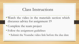Class 21 instructions include watching a video with advice for assignment 19, completing the team project by following guidelines and submitting a Youtube video link before the due date. The team project involves having a conversation with your group to discuss one question from page 119, giving details in answers. Video assignment tips are to ensure all group members are seen and heard clearly by speaking loudly and showing your face to the camera.