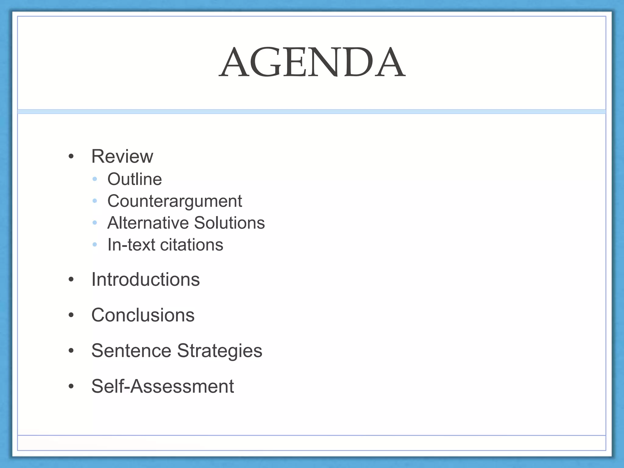 This document provides an agenda for a class that covers various aspects of writing a proposal essay, including outlining, counterarguments, alternative solutions, citations, introductions, conclusions, and sentence strategies. It discusses potential outline structures, the difference between counterarguments and alternative solutions, strategies for writing introductions and conclusions, and how to avoid ambiguous language and sentences lacking agents. Students are assigned homework to add an introduction and conclusion to their draft, check for clarity and agents, and submit a self-assessment.