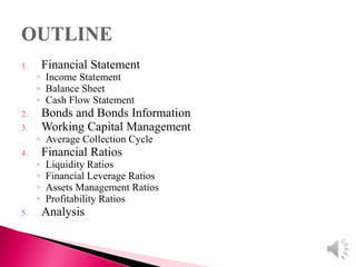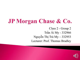 This document provides financial information about JPMorgan Chase & Co. for the years 2008-2014. It includes income statements, balance sheets, and cash flow statements. The income statement shows revenues, expenses, and net income. The balance sheet lists assets, liabilities, and equity. The cash flow statement shows cash from operating, investing and financing activities. In addition, the document provides details on JPMorgan Chase's business segments and selected bond information.