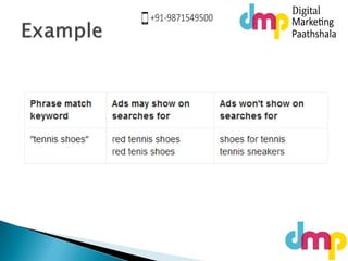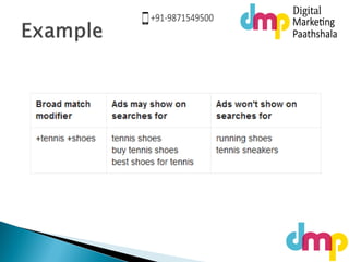 The document discusses Google AdWords matching options including broad match, phrase match, exact match, and negative match, explaining how each keyword type affects ad visibility. It emphasizes the importance of approval statuses for ads, detailing what each status means for ad display capabilities. Additionally, the document highlights several specific reasons why ads may not be shown, based on their approval status and compliance with advertising policies.