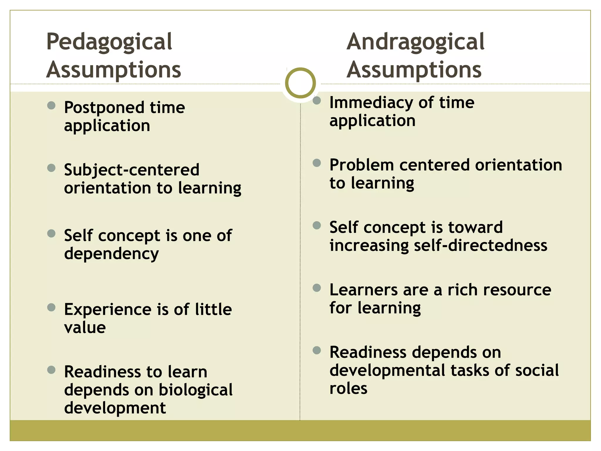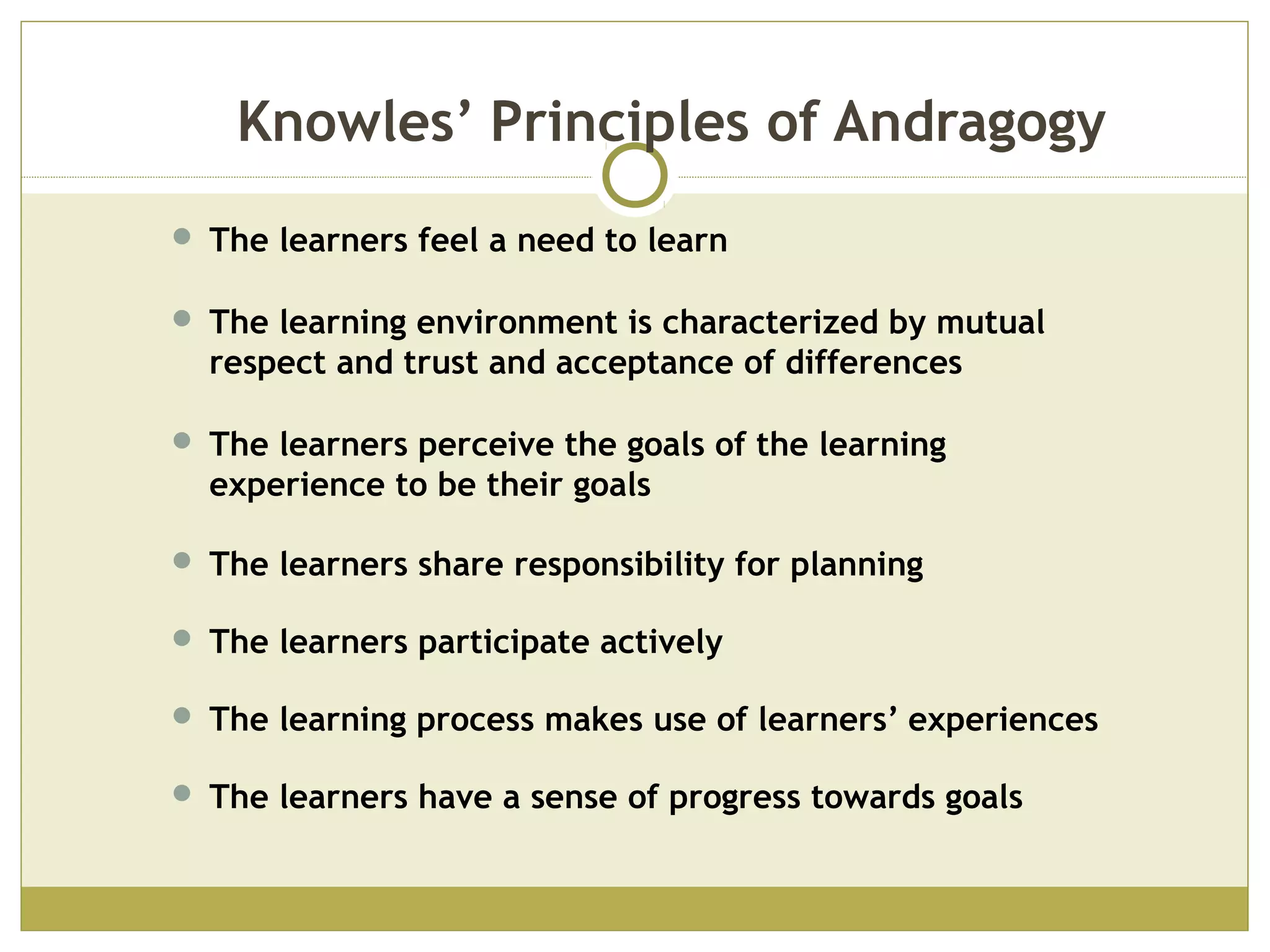 Knowles' principles of andragogy outline how adults learn best. They include that adults learn best when they feel a need to learn, are respected and trusted by others in their learning environment, help plan their learning, and can apply their experiences. Andragogical teaching focuses on self-directed learning, problem-centered orientation, and mutual planning between teacher and learner. Grow's stages of learning autonomy show how learners progress from dependent to self-directed, while Kolb's model emphasizes learning through concrete experience, observation, conceptualization, and experimentation.