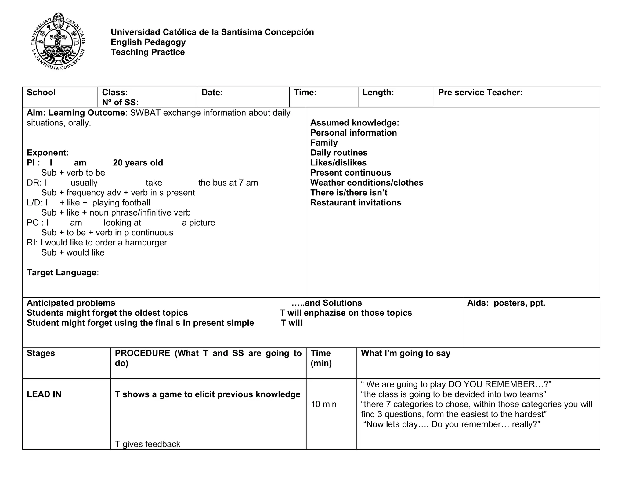 This document contains details about an English pedagogy teaching practice session, including the aim, target language, stages of the procedure, and anticipated problems and solutions. The session aims to have students exchange information about daily situations orally. It will review topics covered in the semester through games, exercises, and roleplays focused on personal information, daily routines, likes/dislikes, and restaurant interactions. The teacher will provide feedback and address common mistakes.