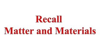 The document discusses the properties of different materials. It defines hard materials as those that cannot be easily compressed, cut, bent or scratched, with examples being brick, bone and steel. Soft materials are defined as those that can be easily compressed, cut, bent or scratched, with examples being foam and clay. Shiny materials are those that reflect light well, such as gold and diamonds, while dull materials do not reflect light well, like candles and paper. Rough materials have an uneven surface with ups and downs, exemplified by bricks and rocks, whereas smooth materials have no ups and downs on their surface, like mirrors and tiles. The document ends with an assignment to identify the odd one out in three pairs of materials based on these
