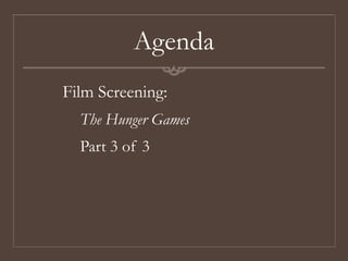 The class agenda includes screening the final part of the film The Hunger Games. Speeches for the class will begin on Wednesday, December 5th, and all students should be prepared to present first. Students should work on extras for their speech presentations, study for a vocabulary makeup test, bring their final speech in hard copy to class, and bring their essay for revision work.