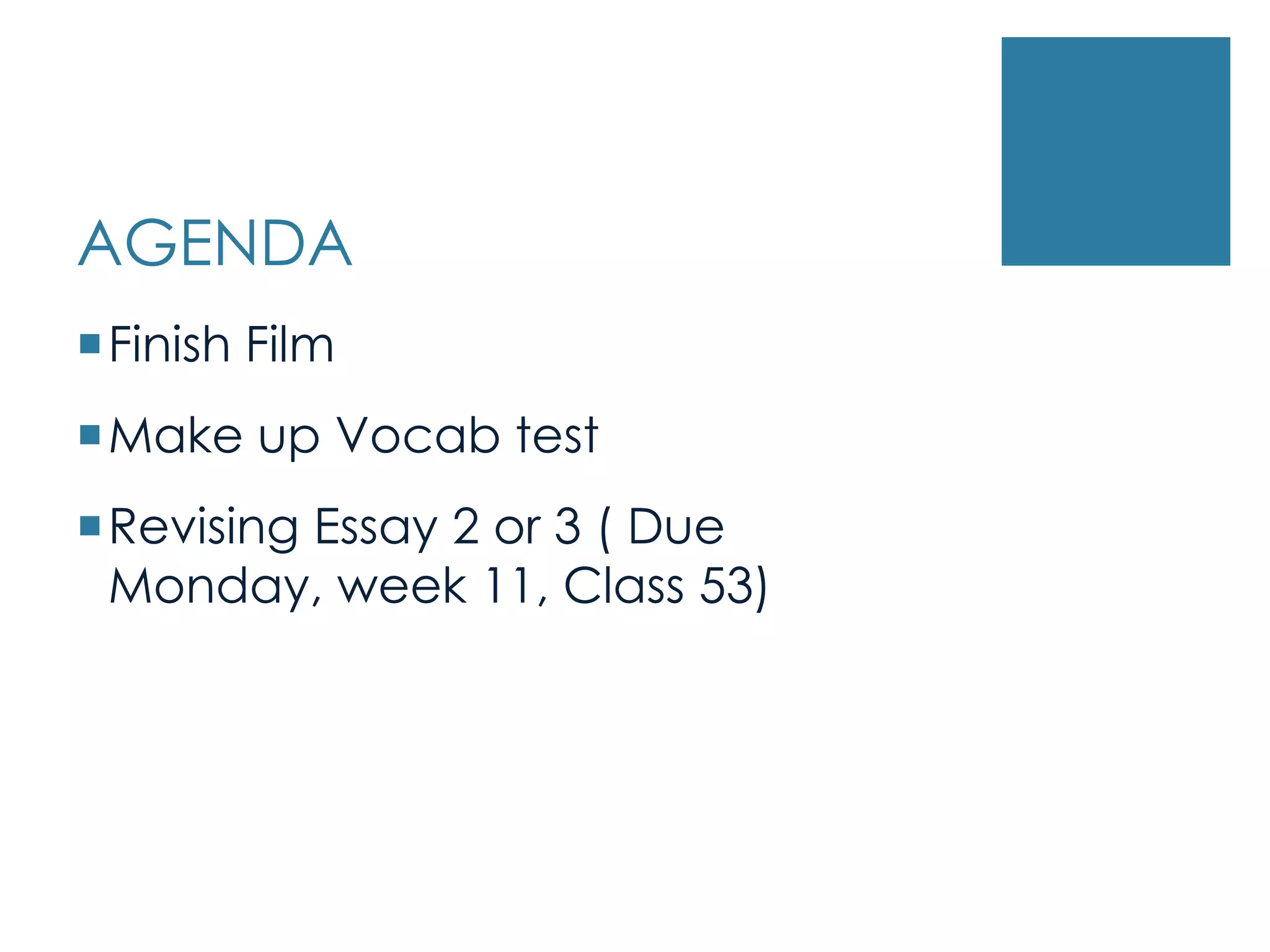 This class agenda covers finishing a film, making up a vocab test, and revising Essay 2 or 3 which is due the following Monday. It schedules oral presentations for the next three class periods and says students will lose points for any presentations missed. Students can make up one vocab test and have 15 minutes to complete it. Guidelines are provided for revising the essay, including checking comments, addressing issues, and not just fixing grammar. Students are reminded to submit revised essays electronically by the start of class on the due date and that significant revision is needed to improve the grade. The homework listed is to work on speech presentation extras due the next day and bring the essay for in-class revision work.