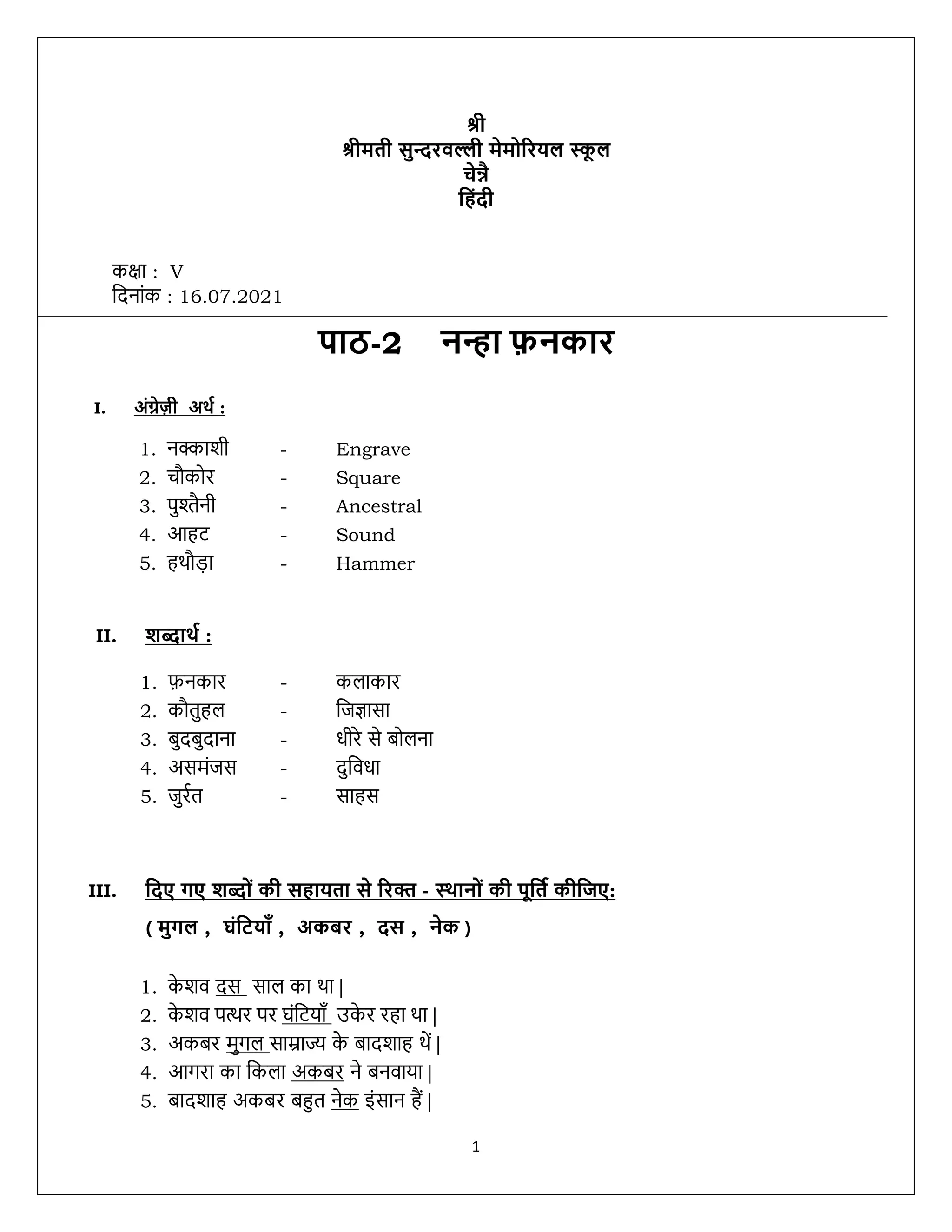 III. हदए गए शब्दोिं की स ायता से ररक्त - स्र्ानोिं की पूहतथ कीहिए: