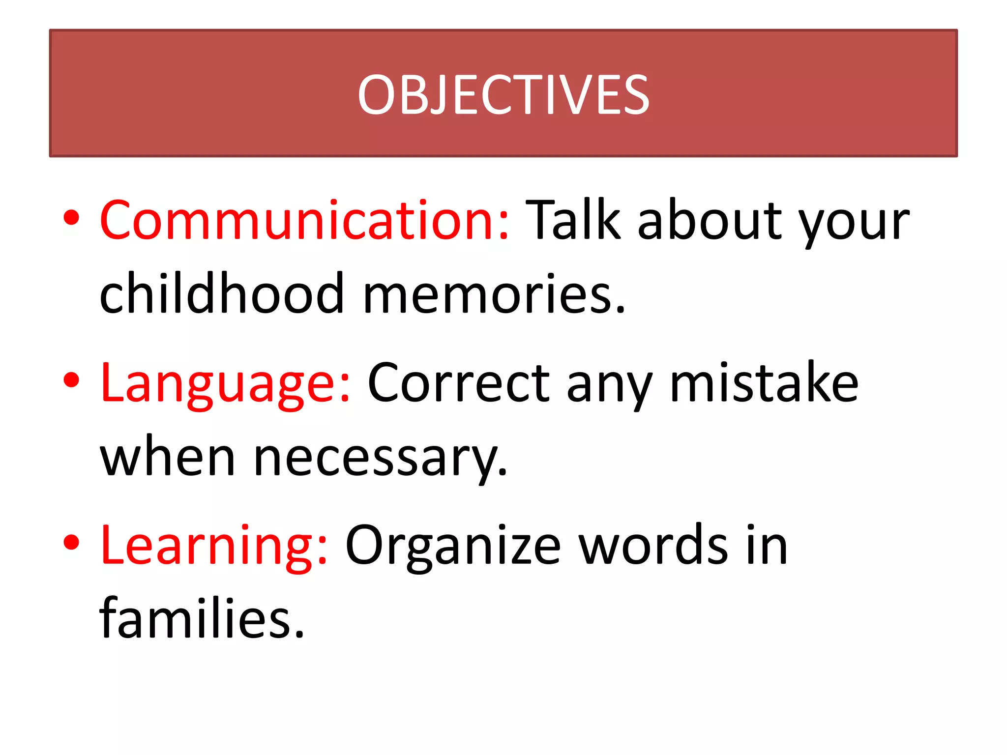 The document outlines the objectives, accusations, and lessons from a class. It aims to improve communication skills, language skills by correcting mistakes, and learning by organizing words into families. It also contains strategies for asking follow-up questions, correcting mistakes, and showing interest in conversations, as well as homework assignments to upload presentations and enjoy the weekend.