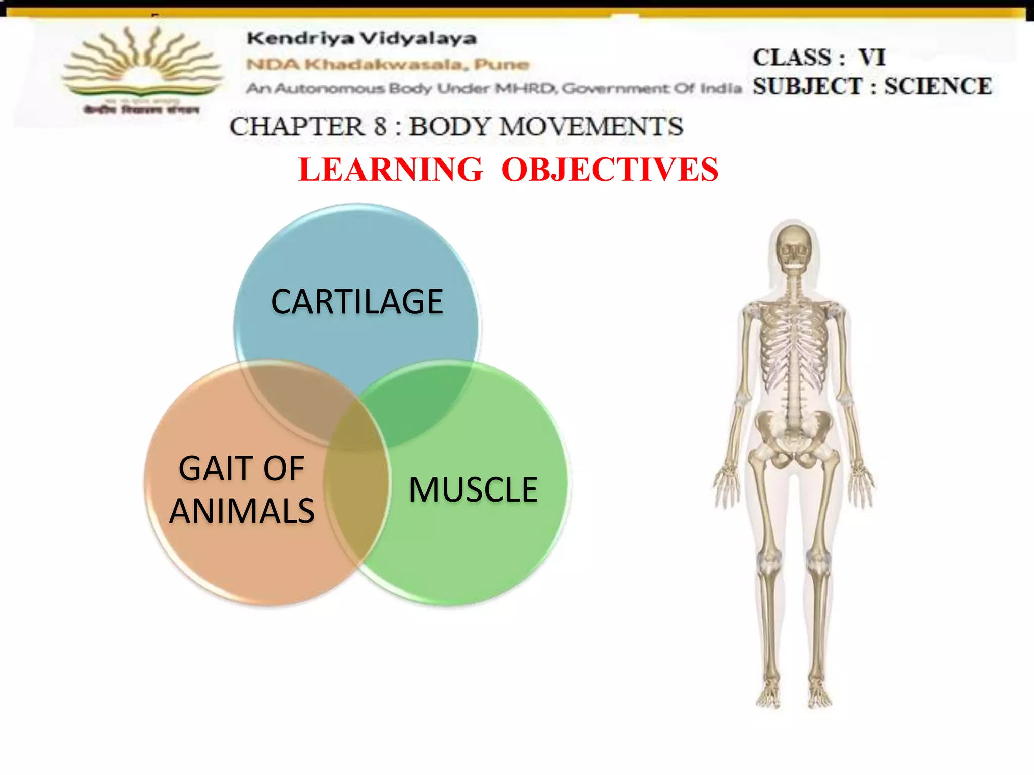 Cartilage is found in parts of the skeleton like the ear and nose and helps allow bending, while muscles help enable movement by contracting and relaxing in pairs to pull bones in different directions. The gaits of different animals like earthworms, snails, cockroaches, fish, birds, and snakes vary according to their skeletal structures - earthworms extend and contract their ring-like bodies, snails glide on mucus, cockroaches walk and fly with legs and wings, fish use fins and a streamlined body to swim, birds fly with hollow wing bones, and snakes move by curving their long backbone.
