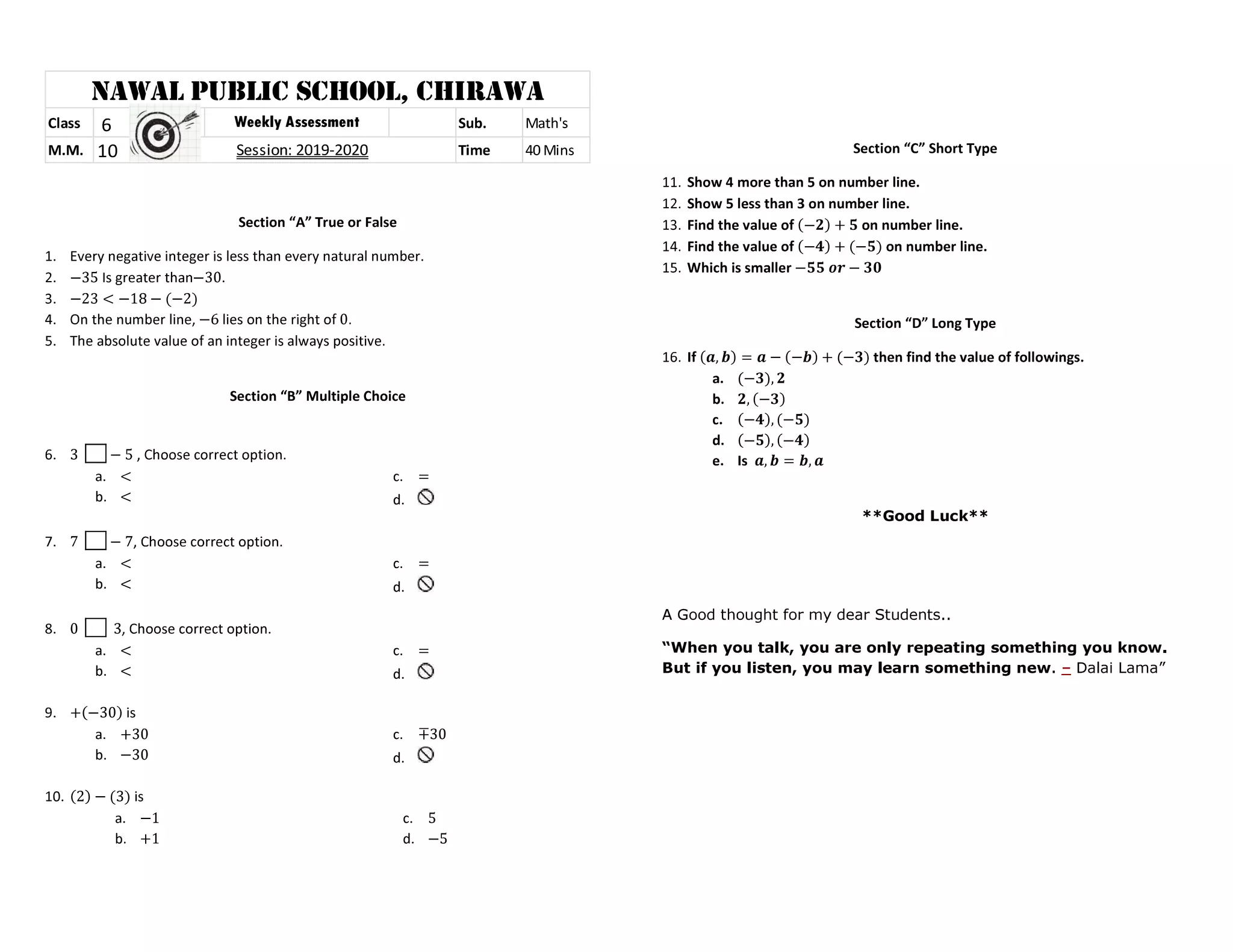 Mathematics Class 6 Paper
