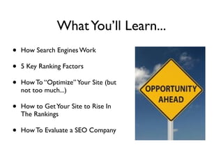 This document provides an overview of search engine optimization (SEO) fundamentals. It discusses how search engines like Google work, key ranking factors like keywords, content, links and social media. It emphasizes the importance of natural, high-quality content and links over manipulative tactics. The document also covers how to evaluate SEO companies and stresses that SEO requires ongoing effort to see results.