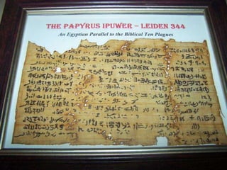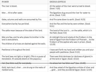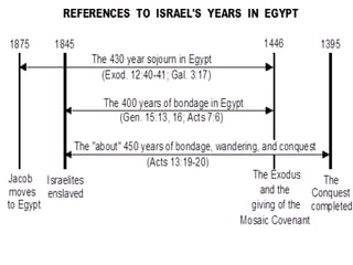 This document summarizes a class on Exodus and Leviticus. It addresses questions about why God enslaved the Israelites in Egypt, when this occurred, and how long the enslavement lasted. The document also discusses evidence for the plagues and Exodus, including indirect evidence from Egyptian records. It notes debates around the number of Israelites who left Egypt and whether events like the plagues and crossing of the Red Sea were natural or supernatural. The class addressed other topics like who hardened Pharaoh's heart and New Testament references to spiritual sacrifices replacing older sacrifices.