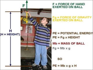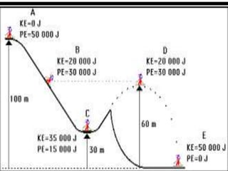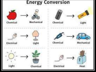The document provides an overview of energy and work, defining work as the force applied to move a body and measuring it in joules. It explains different forms of energy including mechanical, heat, light, chemical, sound, magnetic, electrical, and atomic energy, as well as the relationship between potential and kinetic energy. Additionally, it discusses the conservation and transformation of energy, describing various examples of energy conversion and factors affecting potential and kinetic energy.