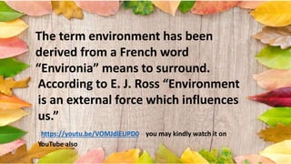 2) It defines the environment as the surroundings or conditions in which living things live, including biotic (living) and abiotic (non-living) components.