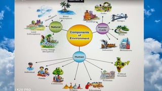 3) The natural environment has four main components - lithosphere, hydrosphere, atmosphere, and biosphere - which include land, water, air, and living things that interact in ecosystems.