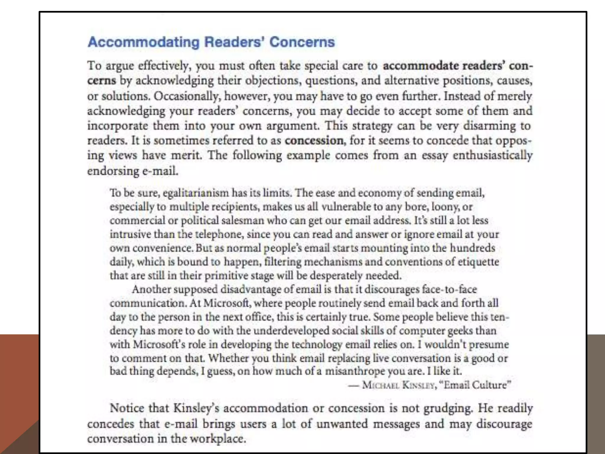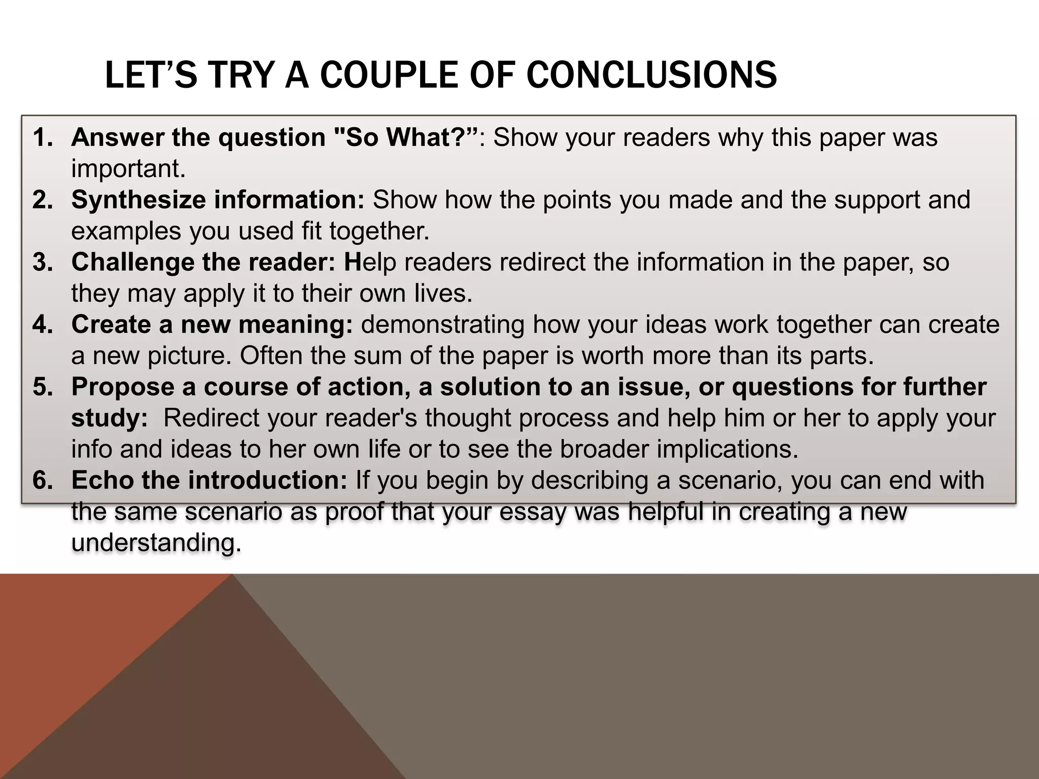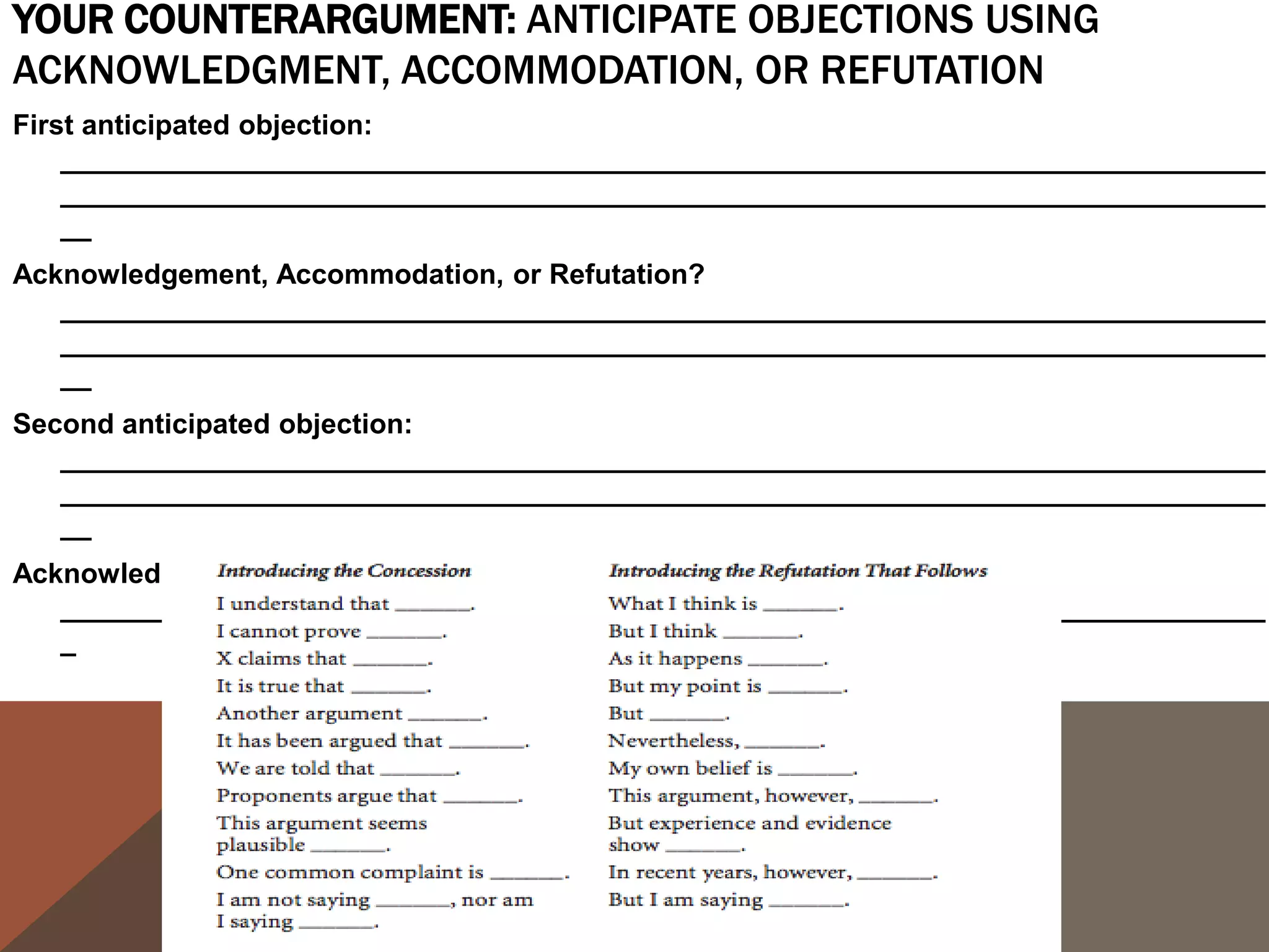 - Guidance on writing conclusions, considering opposing arguments, and M