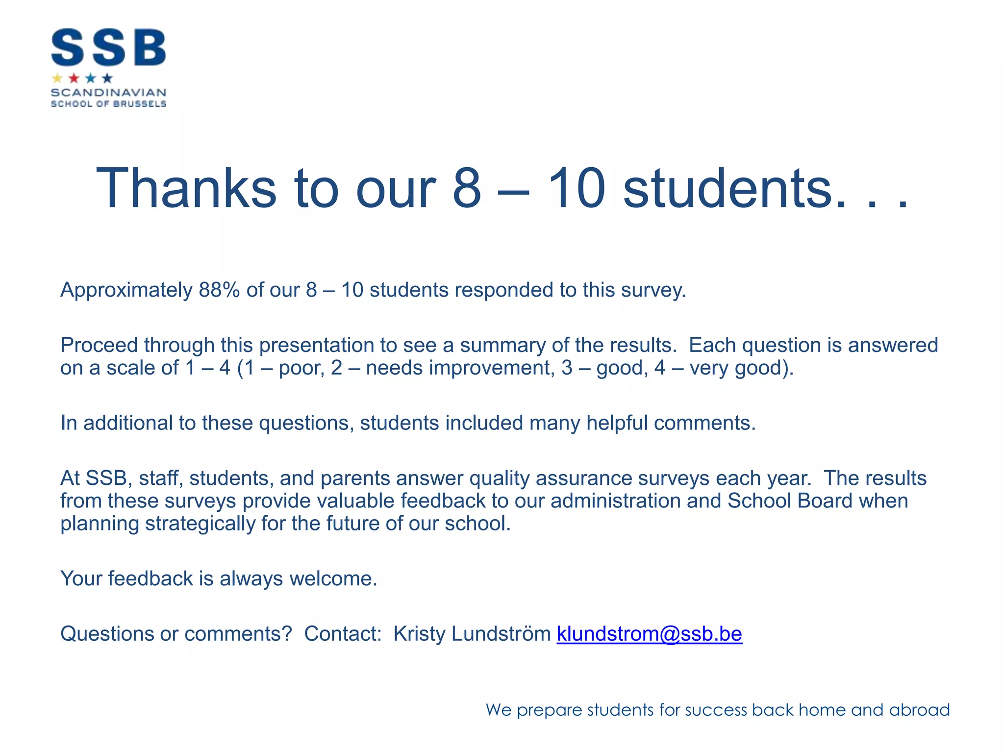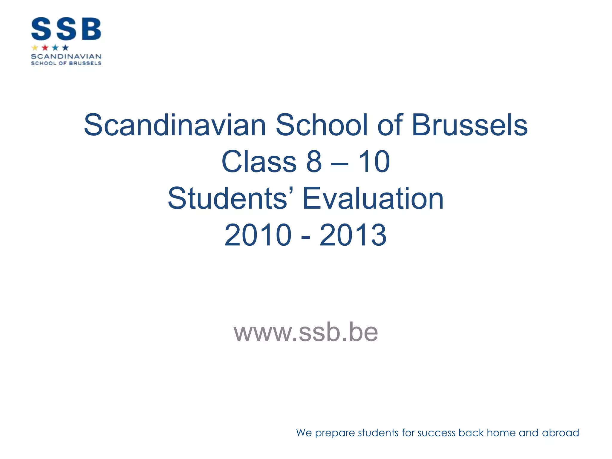 The document summarizes survey results from 2013 about students in grades 8-10 at the Scandinavian School of Brussels. Approximately 88% of students responded. Survey results showed that students were generally satisfied with their learning environment and safety at the school. Areas identified for improvement included strengthening the school's learning cycle assessment tool and ensuring students feel motivated in their work. The analysis noted that recent class reorganization affected some students' satisfaction by separating Norwegian students from other nationalities.