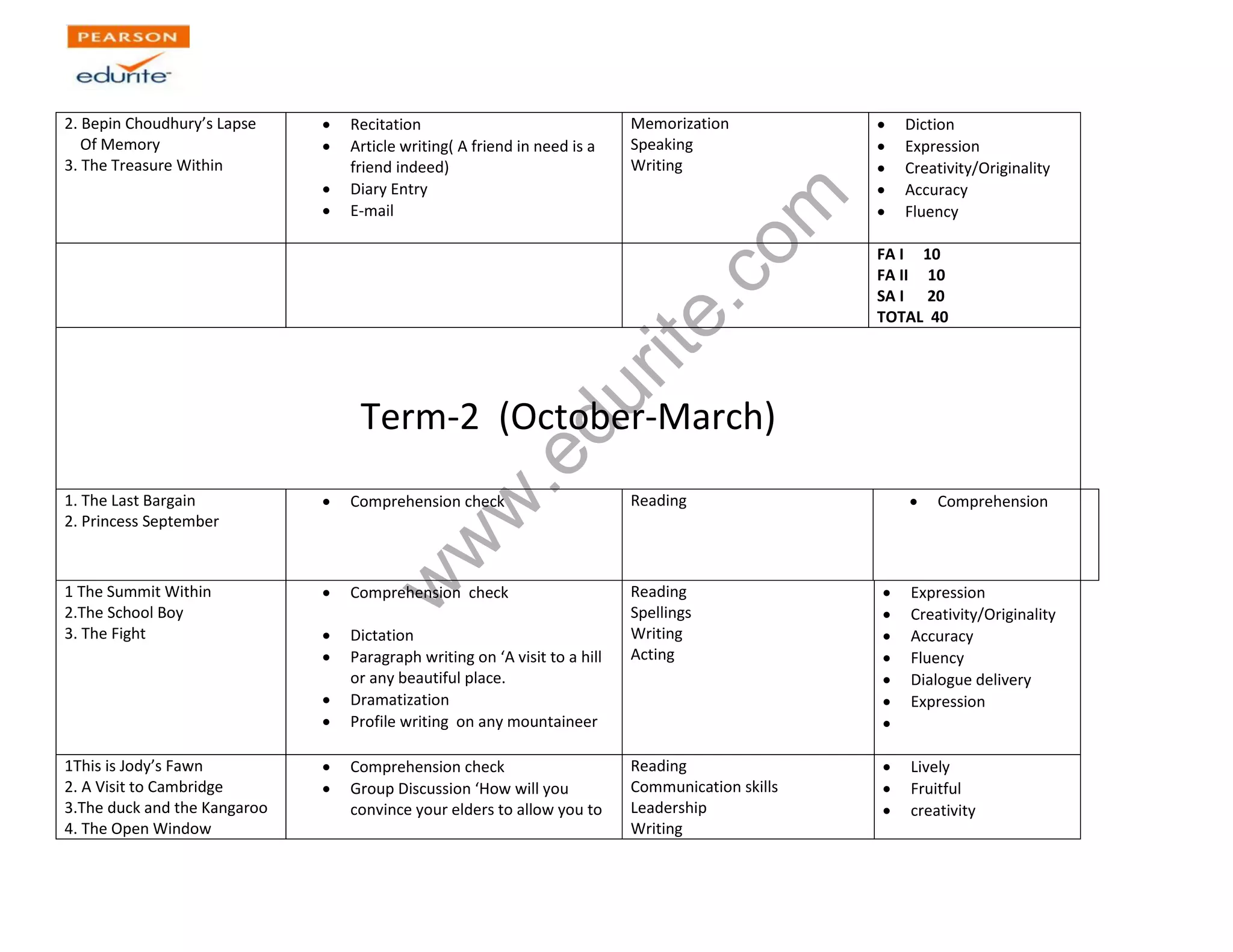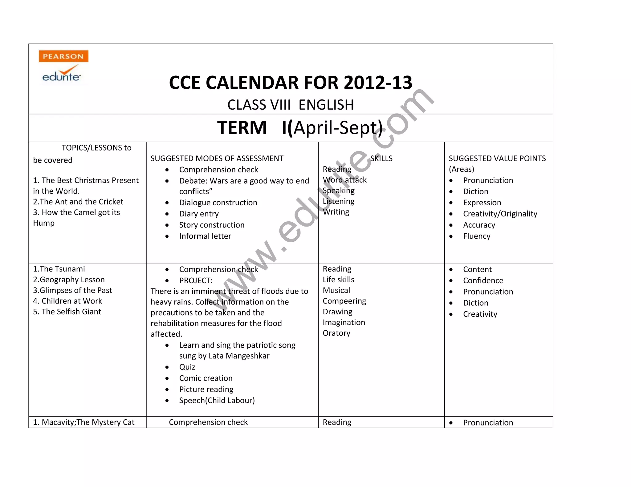 The document outlines the curriculum and assessment methods for Class VIII English for the Kendriya Vidyalaya Sangathan for the 2012-13 academic year. It includes topics for both terms, suggested modes of assessment, and areas of focus such as comprehension, creativity, and communication skills. The curriculum incorporates various activities like debates, project work, and creative writing to enhance student learning.