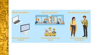 This document provides an introduction to economics, discussing key topics like scarcity of resources, economic activities, microeconomics, macroeconomics, and basic economic problems. It explains that economics involves recognizing scarce resources, prioritizing their use efficiently, engaging in economic activity, and understanding problems like poverty and inflation. Microeconomics examines individual decision-making in markets, while macroeconomics considers whole economy decisions made by governments. Some basic economic problems societies must address are what and how to produce goods and services, and who they should be produced for.