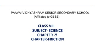 The document discusses the concept of friction, defining it as a force opposing motion between surfaces in contact, and outlining its types: static, sliding, rolling, and fluid (drag). It covers factors affecting friction, its advantages (e.g., necessary for various applications) and disadvantages (e.g., energy loss, wear and tear), as well as methods to reduce friction such as lubrication and design modifications. The learning outcomes include understanding friction terminology, the significance of friction, and differentiating between its types.