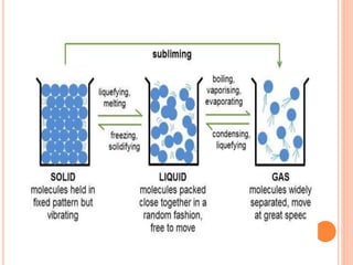 This document provides an overview of the basic concepts of matter, including the kinetic theory, the states of matter (solid, liquid, gas), and the characteristics and behavior of molecules in each state. It explains intermolecular forces, changes of state, and the processes of evaporation, boiling, and sublimation, emphasizing their definitions, examples, and the factors affecting these processes. Additionally, it includes homework questions to reinforce understanding of the material presented.