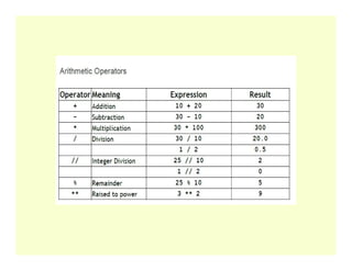 arithmetic (+,-,*,/,%, ** exponent, // Floor division)