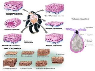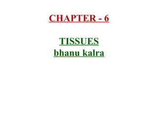 2) Plant tissues are divided into meristematic tissues for growth and permanent tissues for structure. Animal tissues include four main types - epithelial, muscle, connective, and nervous. Epithelial tissues line and cover organs, while muscles allow movement. Connective tissues join tissues together and include bone, blood and cartilage. Nervous tissue carries messages through neurons and nerves.