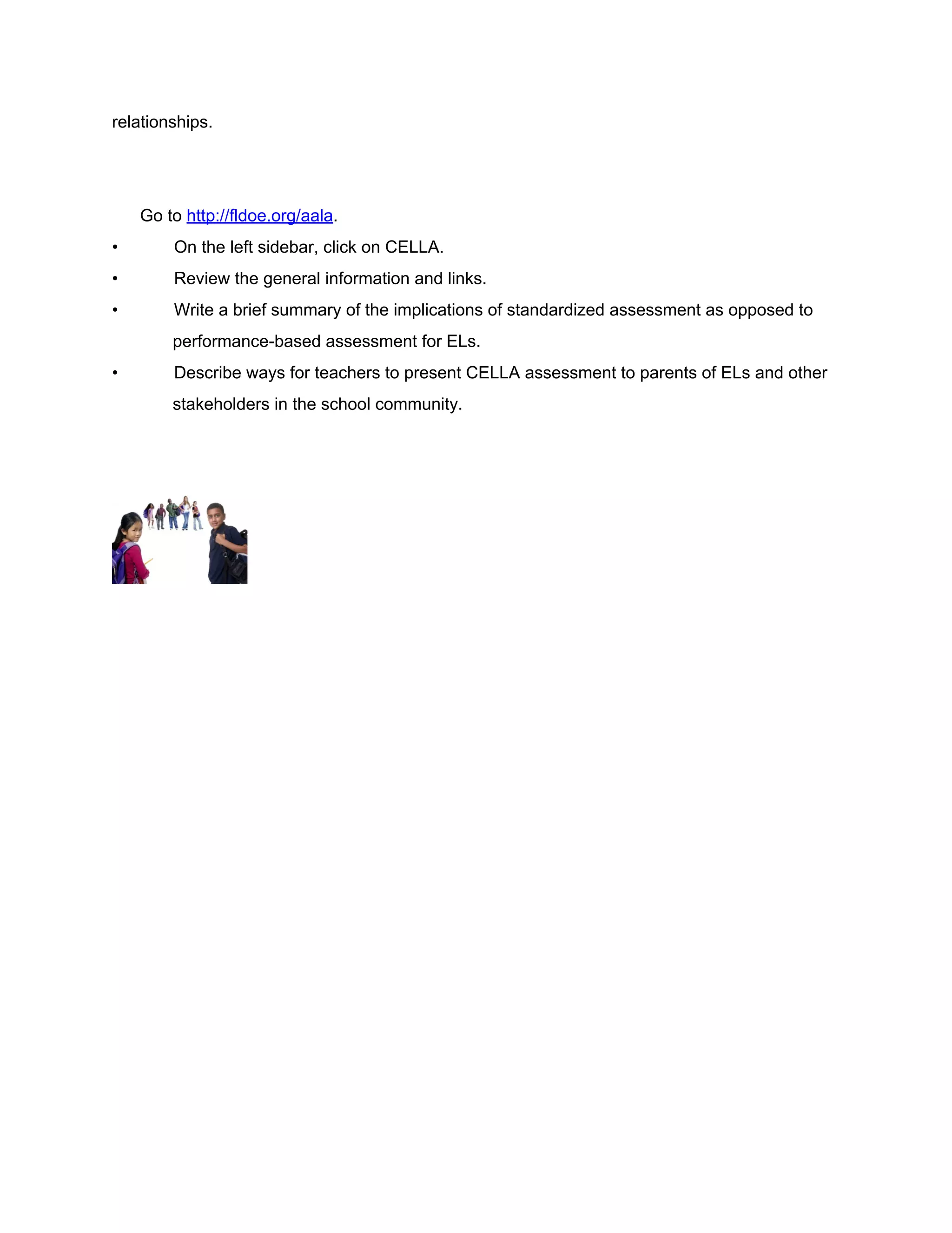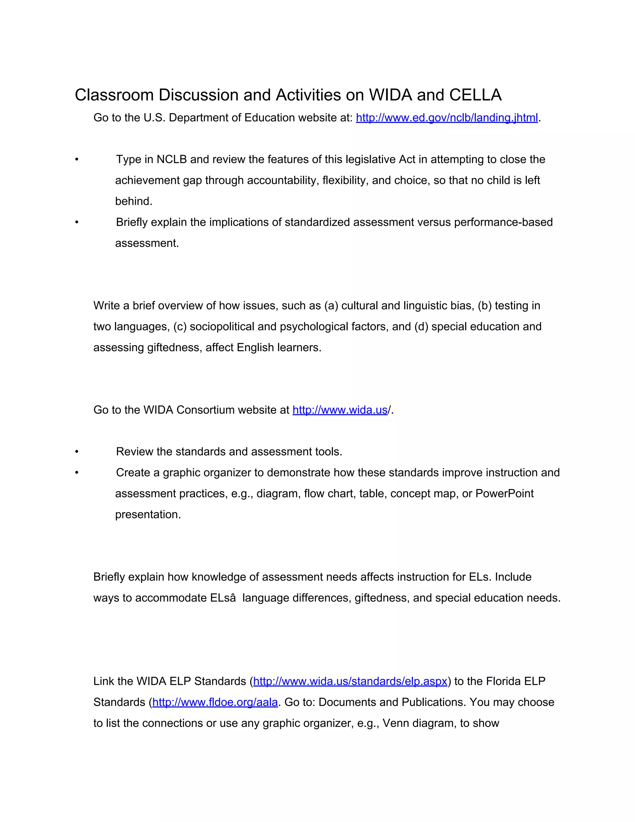 This document outlines classroom activities exploring WIDA and CELLA assessments for English learners. Students are instructed to review features of No Child Left Behind legislation aiming to close achievement gaps through accountability, flexibility, and choice. They analyze how issues like cultural and linguistic bias, testing in two languages, and special education needs affect English learners. Students also learn about WIDA standards and assessment tools, and how knowledge of assessment needs influences instruction for ELs. Finally, they explore connections between WIDA and Florida English Language Proficiency standards, and implications of standardized versus performance-based assessment for ELs based on information from the CELLA website.