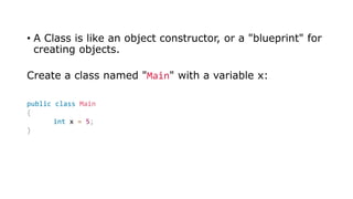 To create an object of Main, specify the class name, followed by the object name, and use the