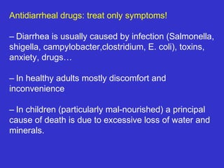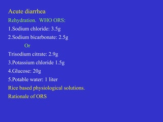 This document discusses the causes, treatment, and management of diarrhea. It begins by defining diarrhea as three or more loose stools in a 24 hour period. The causes of diarrhea include osmotic, secretory, motility issues, altered morphology, allergies, drugs, and certain cancers. Treatment involves rehydration either orally or intravenously. Oral rehydration solutions contain sodium, potassium, citrate, and glucose. Antimicrobial therapy may be used for certain infectious causes. Probiotics can help with antibiotic-associated diarrhea. Management of inflammatory bowel disease is also discussed.