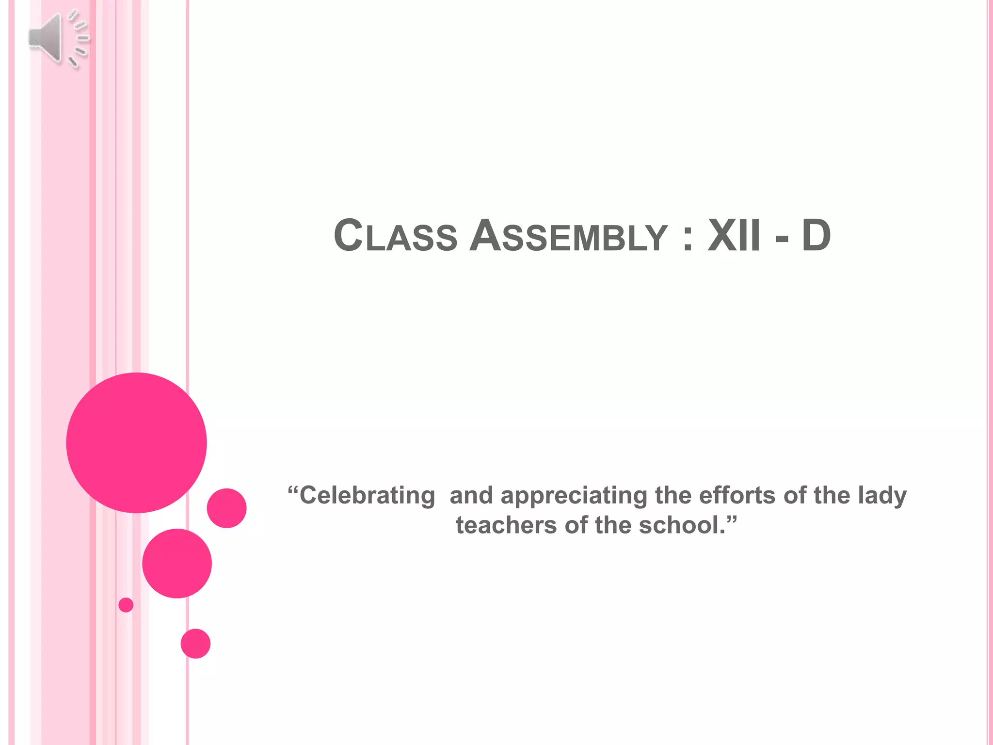 This document summarizes presentations given to celebrate and appreciate the efforts of the lady teachers at a school. It describes several teachers through short phrases and quotes, praising their positivity, dedication to students, and passion for teaching. Key contributions that are highlighted include helping students succeed, bringing foreign languages and cultures to students, and uplifting societal values. The assembly aims to recognize the important role of women teachers in students' lives and education.
