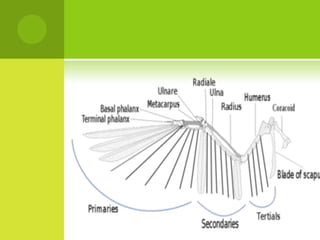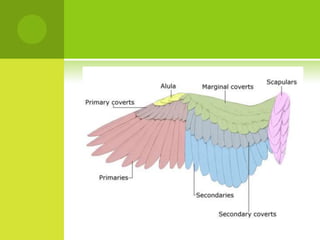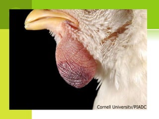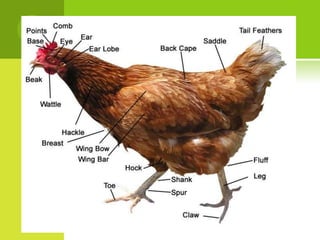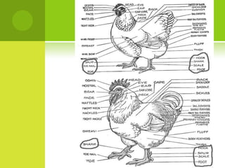 This document summarizes the external anatomy of chickens. It describes key features such as their eyes and eyelids, beaks, combs, wattles, forelimbs used for flight, hindlimbs used for walking, feet, feathers, and skin patterns where feathers do and do not grow. The chicken is classified as kingdom Animalia, phylum Chordata, class Aves, order Galliformes, family Phasianidae, subfamily Phasianinae, genus Gallus, and species Gallus gallus domesticus.