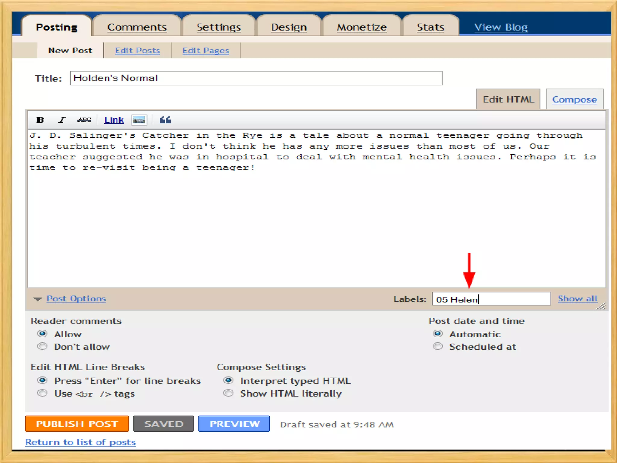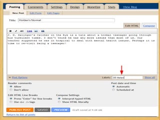 This document discusses using blogs in the classroom and provides recommendations for different blogging platforms. It recommends that teachers can use blogs as a class website (#1), have a class blog for students (#2), or set up individual student blogs (#3). It also provides tips on setting up blogs through Blogger or alternative platforms like Edublogs or Wordpress. Students would use assigned usernames to post and teachers would have administrator access on all blogs. Overall, the document explores how blogs can promote literacy and engagement for students.