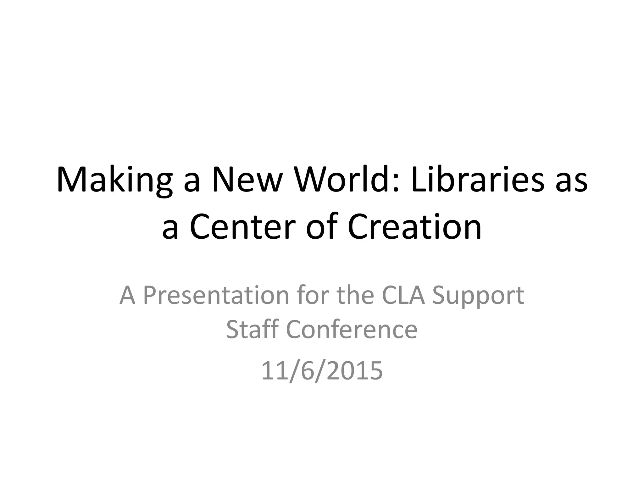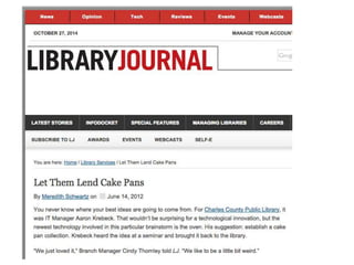 This document discusses the changing role of libraries and librarians. It argues that libraries are shifting from being solely physical spaces that lend books to becoming platforms that provide broader access to both digital and physical resources. Librarians are also changing and taking on new roles like curating makerspaces and tool libraries. The document outlines several examples of libraries that have implemented makerspaces and tools lending to remain relevant in their communities and enable new forms of learning and creation.