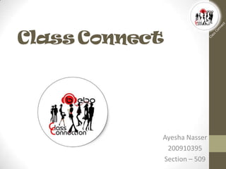 Class Connect is a tool that allows teachers and students to work together and share resources online. It can be used to create and share documents, videos, websites, photos and more related to courses. Teachers can build interactive lectures and students have a place to collaborate. The tool is free to sign up for and easy to use - you simply add courses and files to share with classmates. Class Connect provides a virtual space for online learning communities and file sharing between students and instructors. Both benefits like saving time and connecting easily, and drawbacks like less in-person interaction are discussed.